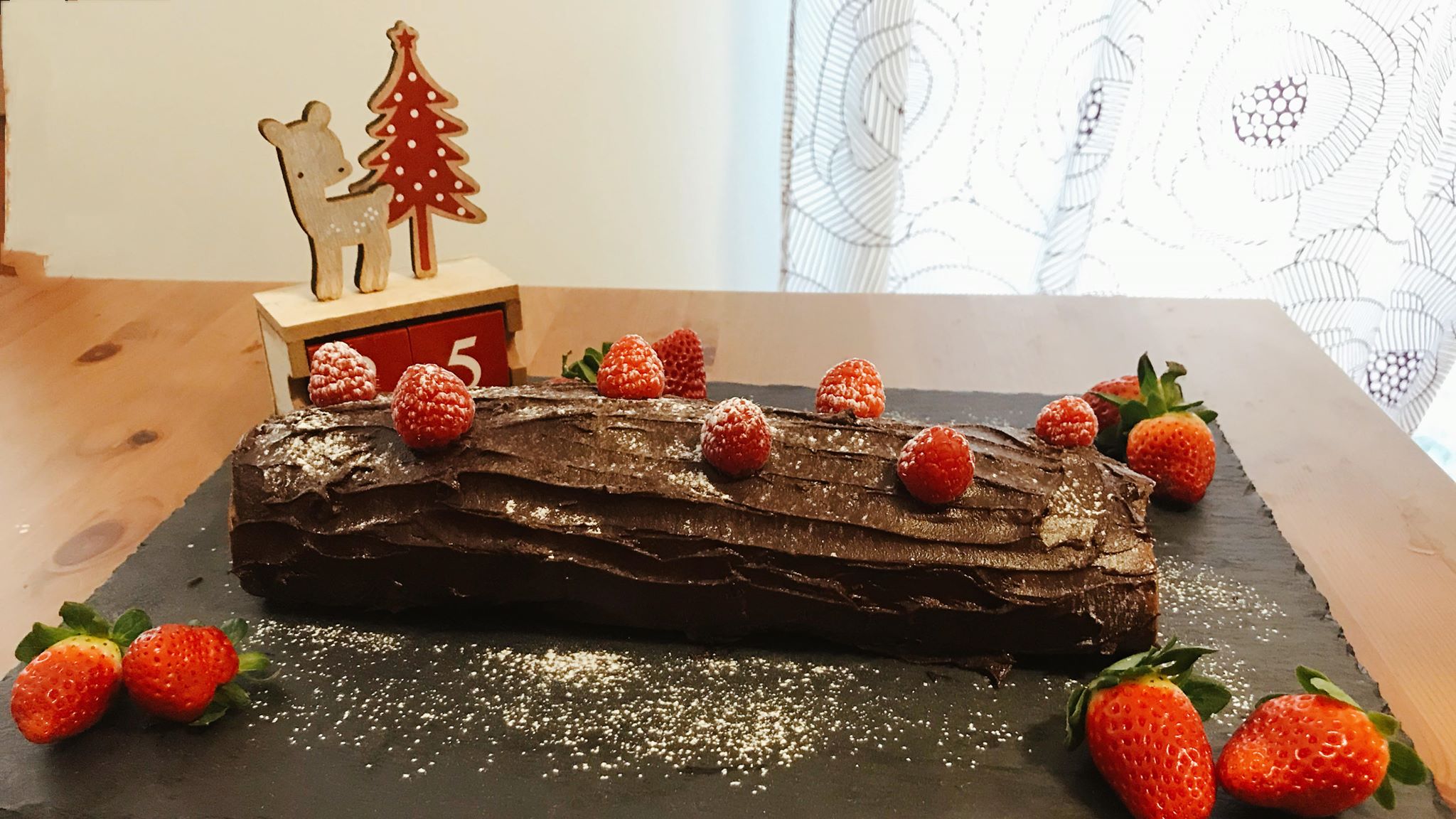 (6)裝飾:將雪好的可麗餅卷拆開保鮮紙,再將頭和尾切去,然後將Ganache塗抹在外面,用抺刀在其上抺出樹皮表面的模樣,再可以在上面加一些莓裝飾,最後灑上糖粉扮雪即可食用,或放入雪櫃3日內食用。