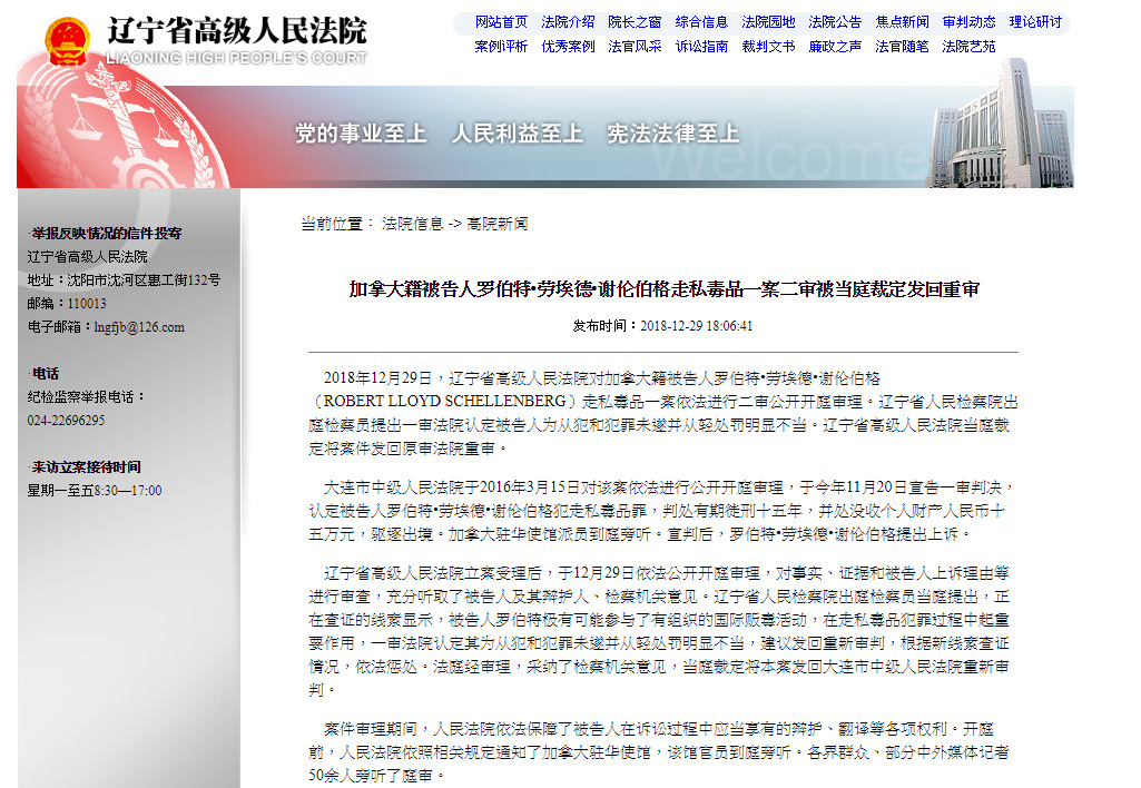 因華為孟晚舟事件,中國及加拿大關係持續緊張之際,今日(12月29日)傍晚遼寧省高級人民法院網頁發通告,指加拿大籍男子謝倫伯格走私毒品一案進行二審,出庭檢察員提出一審法院認定被告人為從犯和犯罪未遂並從輕處罰明顯不當,裁定將案件發回原審法院重審。