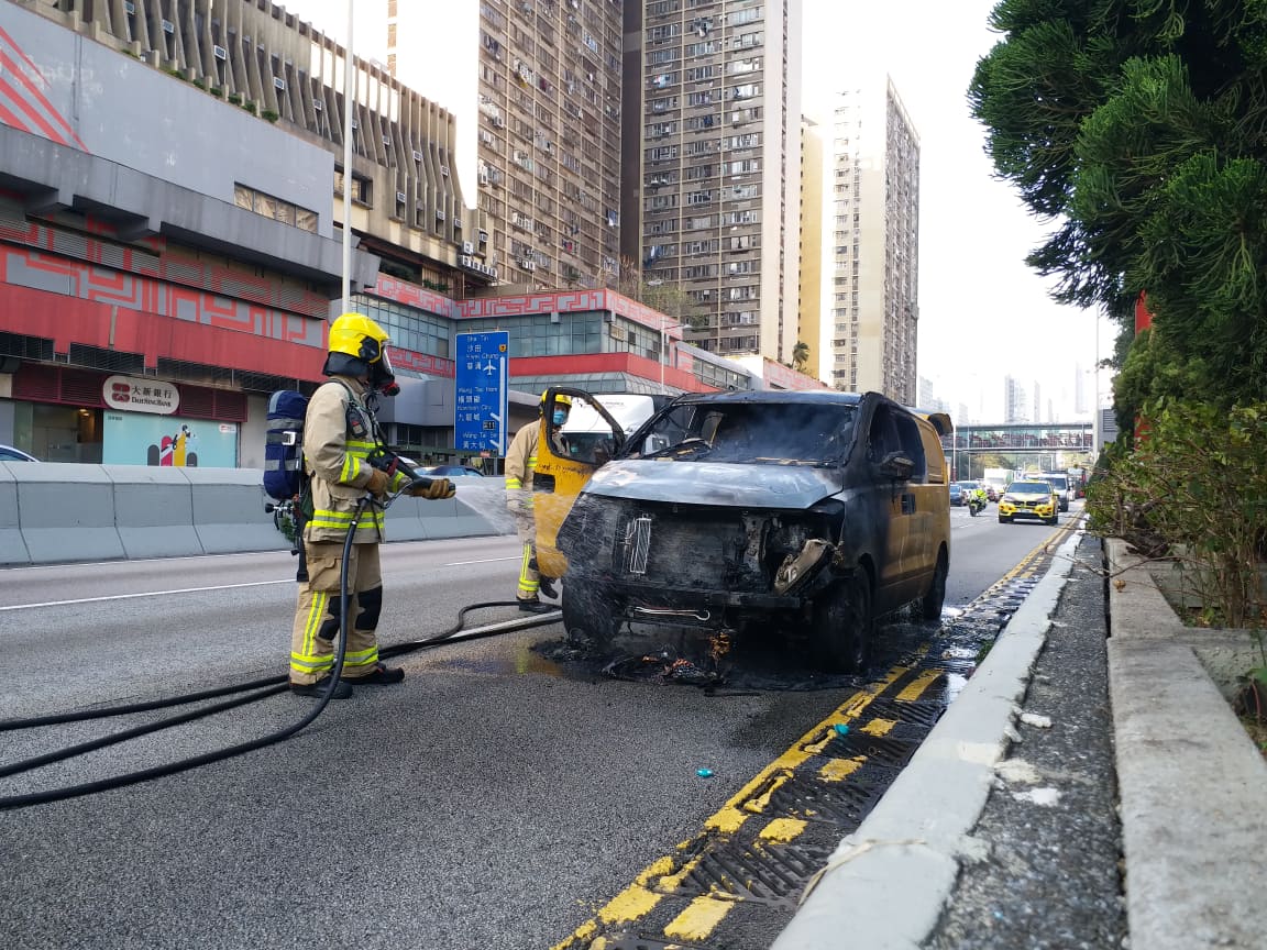 今日(1月6日)早上近9時,一輛客貨車沿龍翔道往觀塘方向行駛,當駛至黃大仙祠對開時,車頭突然冒煙起火。