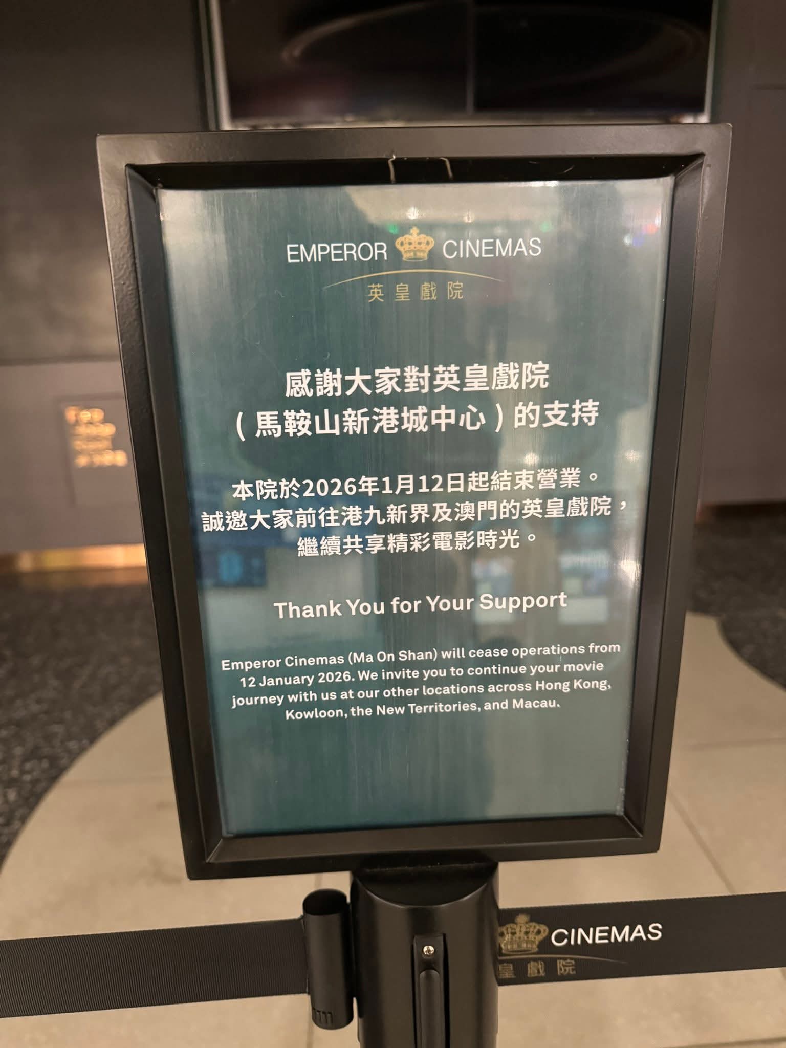 戲院結業潮踏入2026年持續,位於馬鞍山新港城中心的英皇戲院,宣布即日起結束營業。