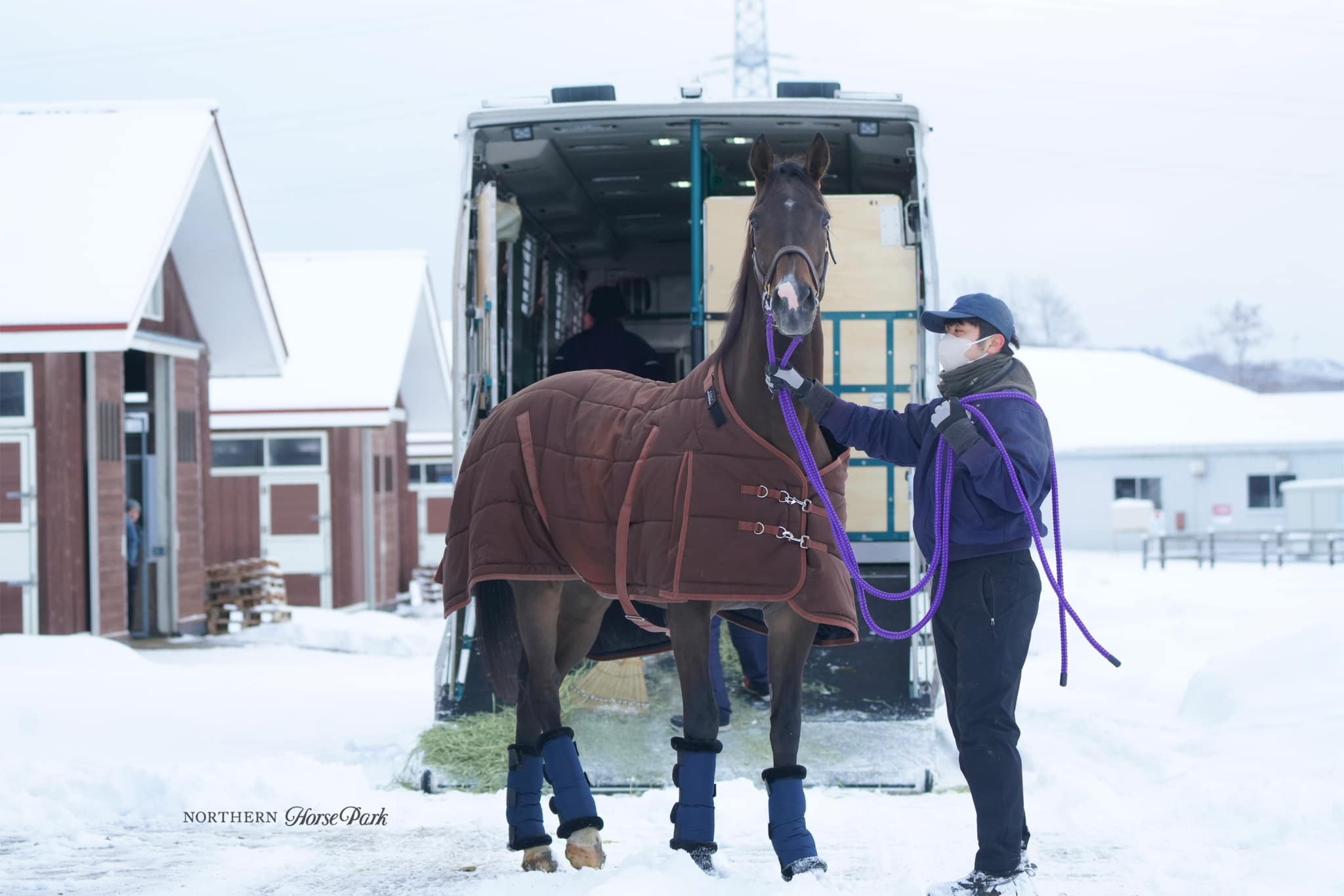 北方牧場於社交網站表示,「金鎗六十」起初第一次看見雪景時感到迷惑,但很快就平靜下來,現在於馬房內休息。