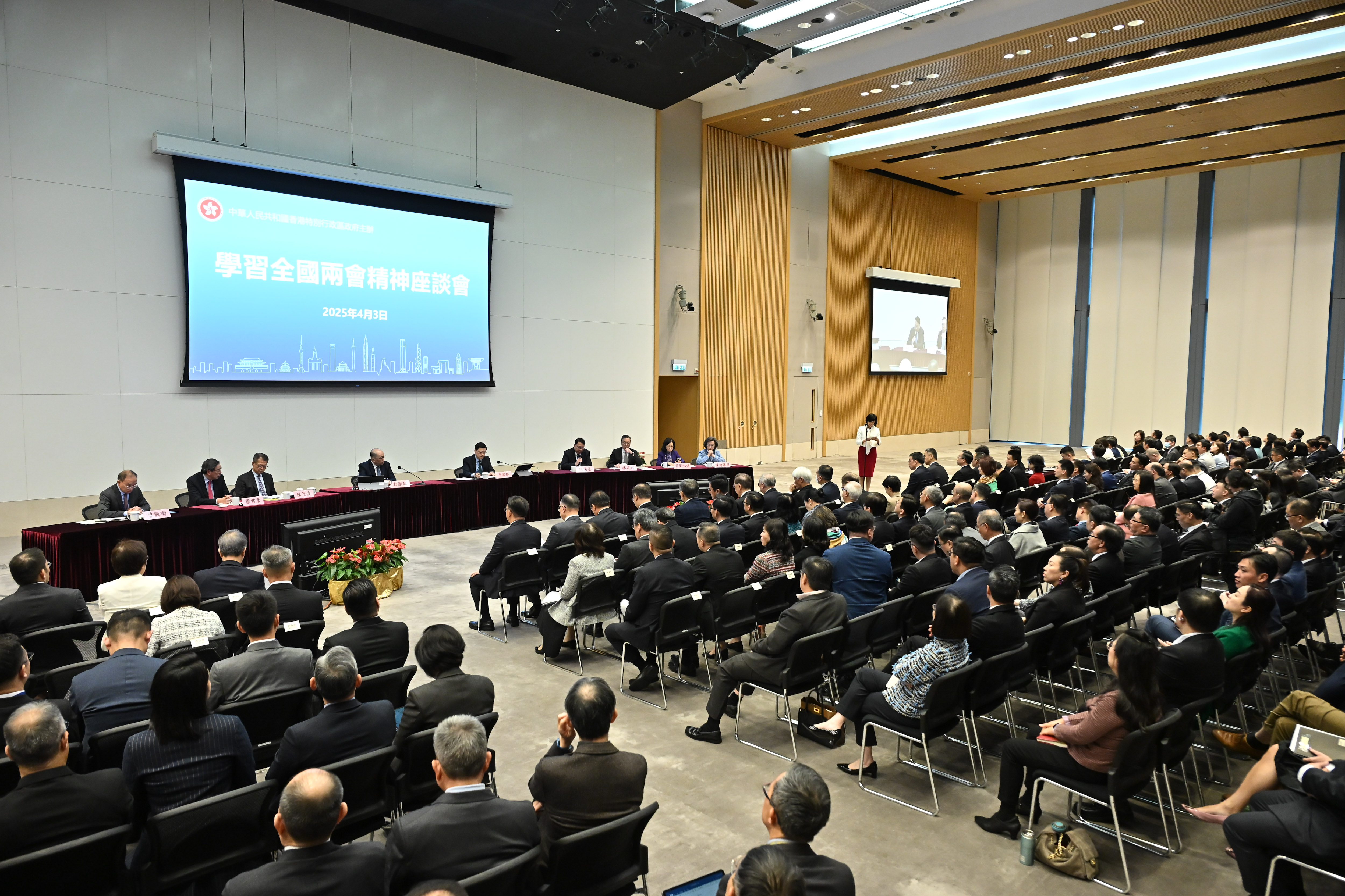 全國兩會在上月圓滿閉幕。香港特別行政區政府今日(4月3日)在政府總部舉辦學習全國兩會精神座談會,讓與會者更深入了解全國兩會的重要內容,以及其對香港特區的重要意義。