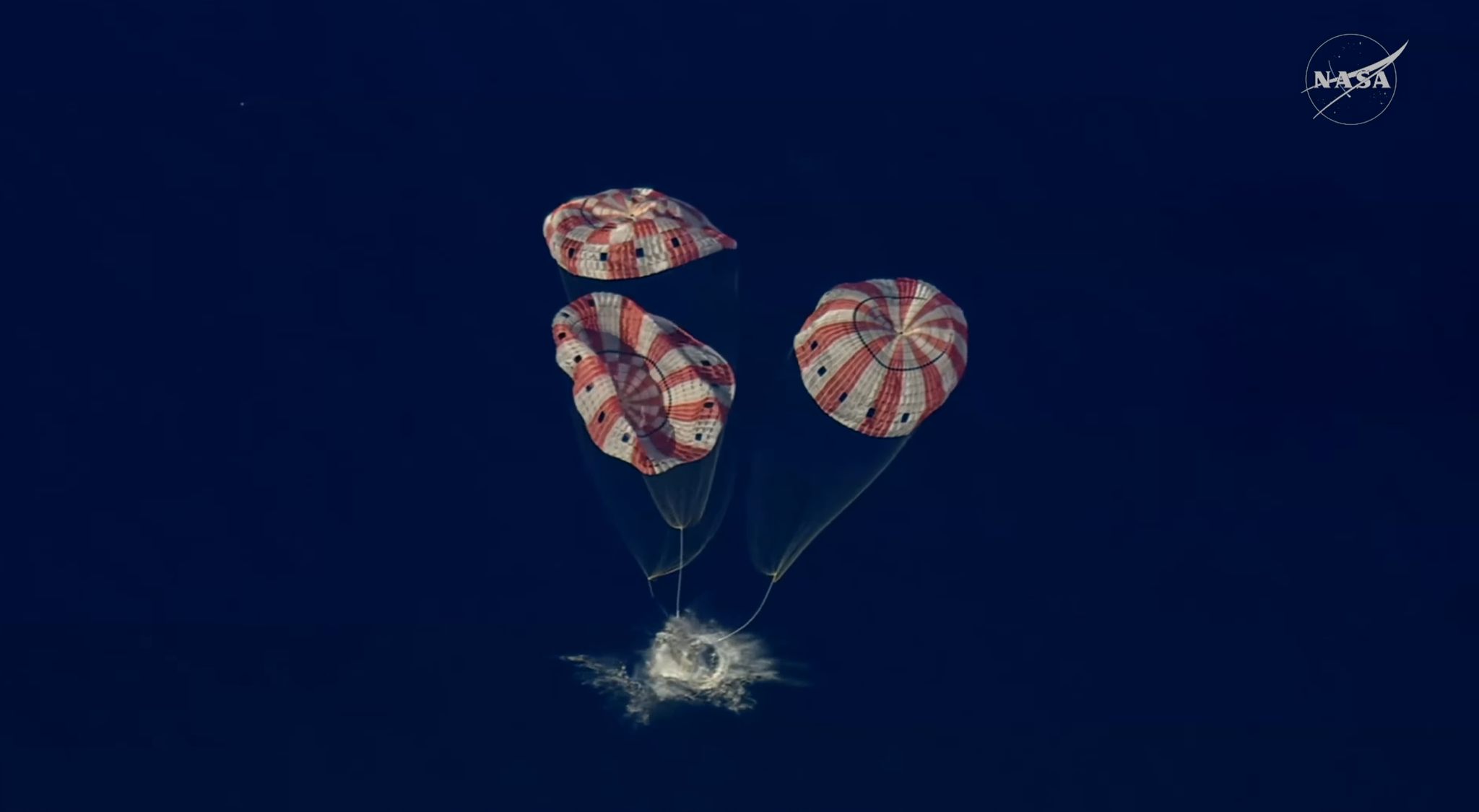 美國太空總署(NASA)這艘名為「誠信號」的「獵戶座」太空船,藉降落傘平穩濺落南加州外海。