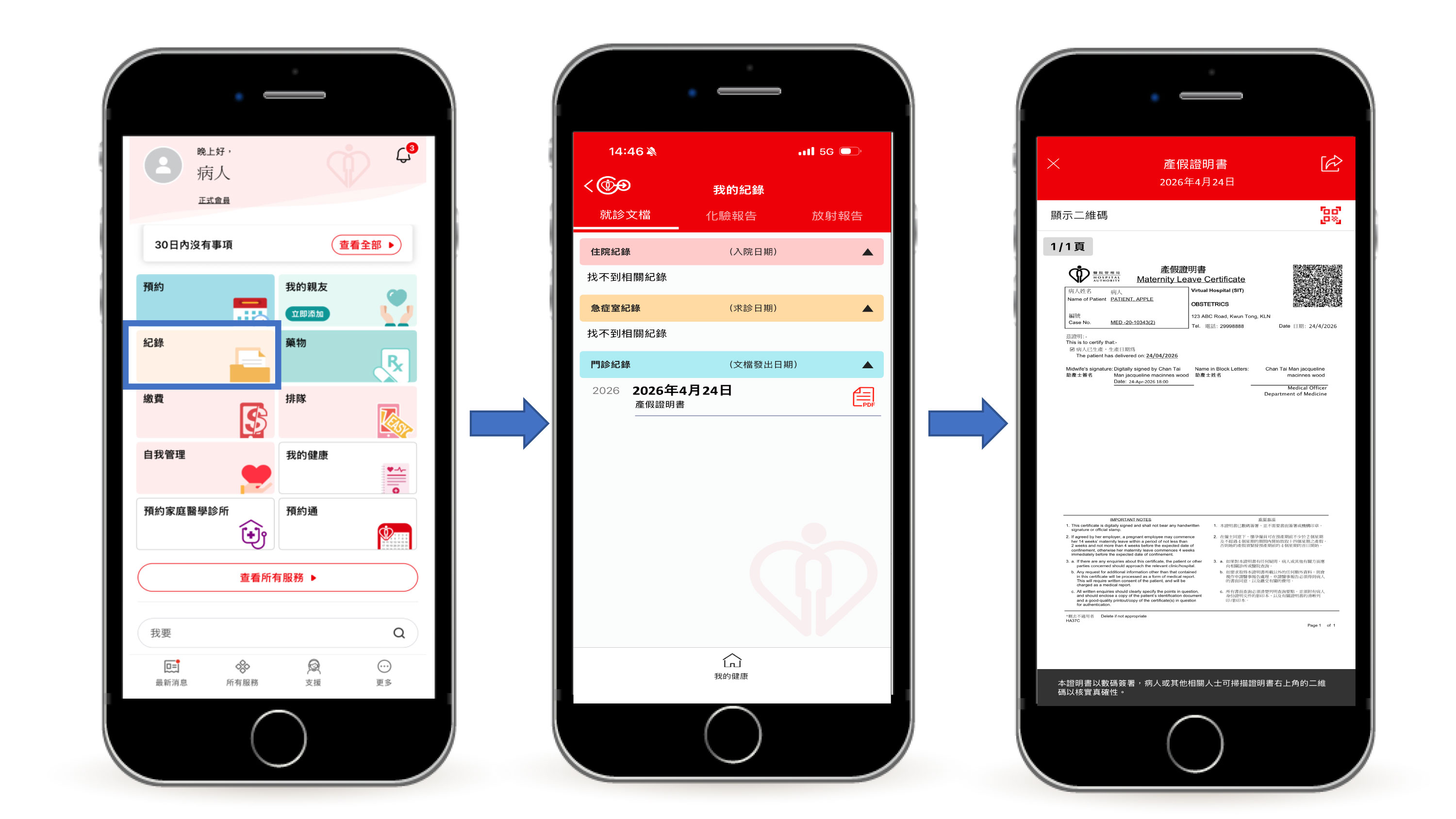 與傳統的手簽紙本證明書一樣,由醫生發出的電子產/病假證明書,以及由助產士發出的電子產假證明書,其電子簽署與手寫簽名具有同等法律效力。電子證明書都會列明病人姓名、懷孕證明、預產期及建議病假日期等資料。