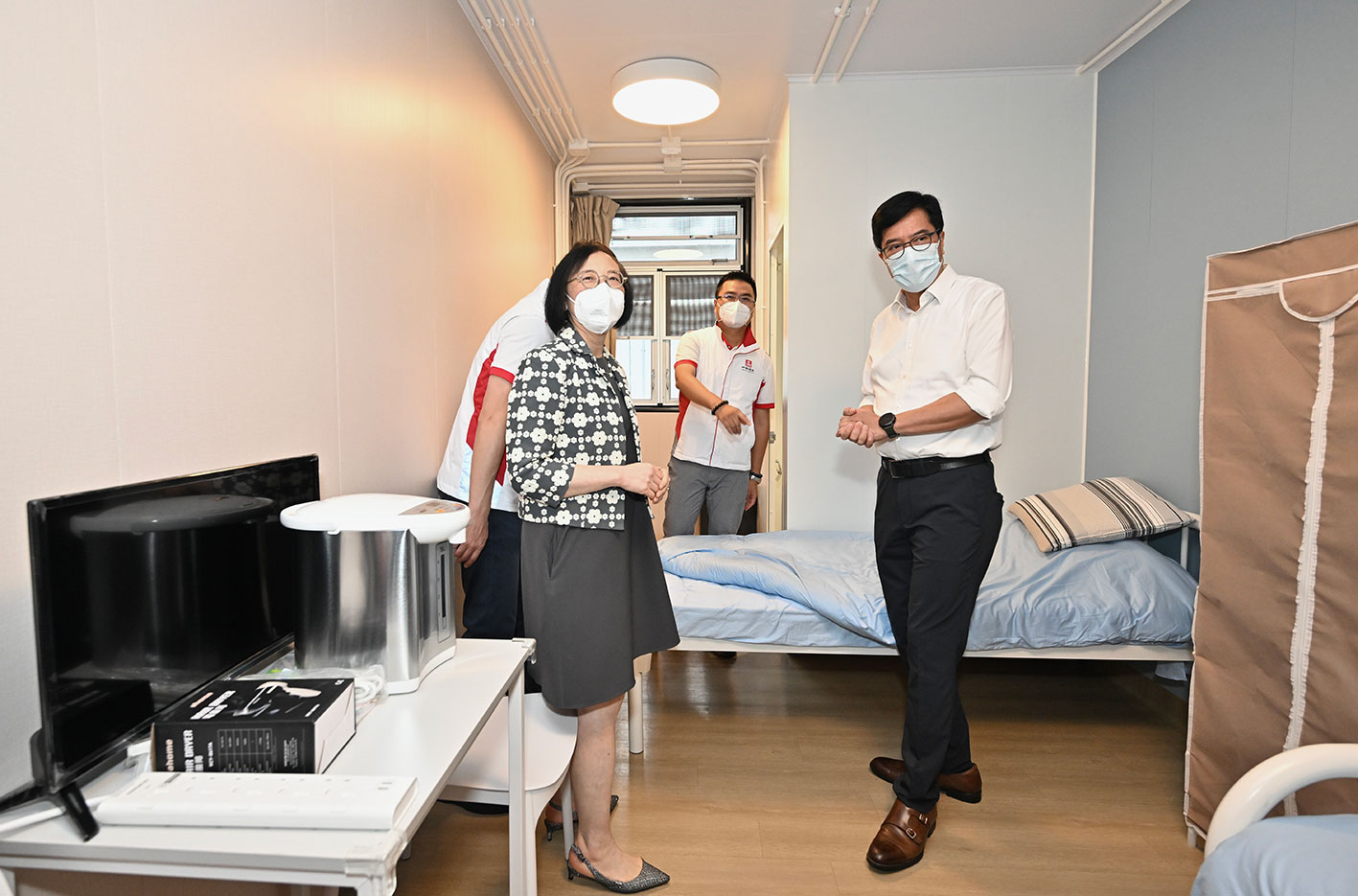 黃偉綸和陳肇始在建築署署長何永賢陪同下,聽取承建商中國建築國際集團助理總裁黃江介紹項目規模和特點,以及施工期間遇到的挑戰。一行人其後視察隔離單位和設施,了解有關設施的運作。