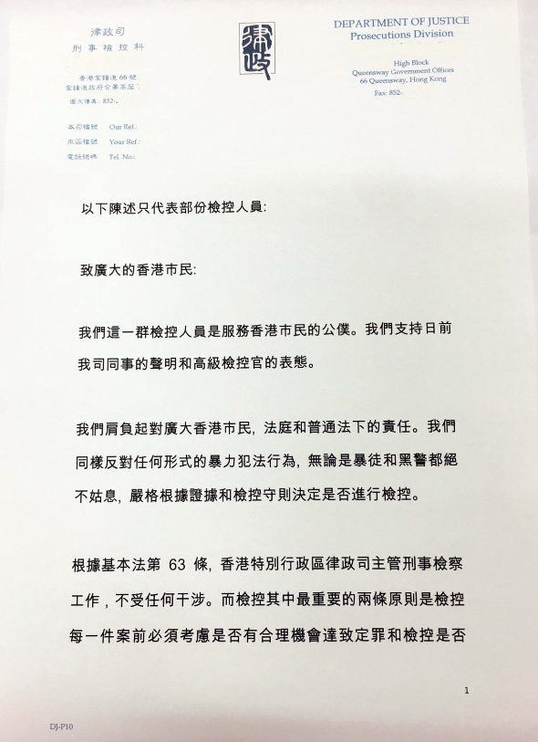 雖然信中提到「以下陳述只代表部份檢控人員,但消息指,參與聯署至少包括5位律政司檢控官。
