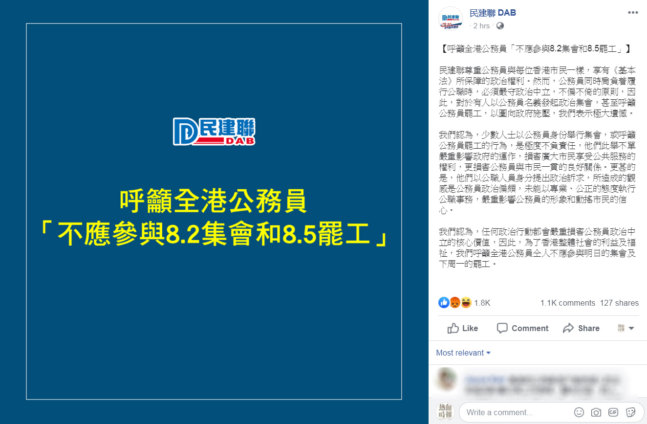 自修例風波之後,近日蘊釀各式各樣的抗爭活動,其中兩個焦點,就是明日(8月2日)的公務員集會,以及下周一(8月5日)的全港大罷工。繼港府發聲明,指公務員必須保持政治中立之後,建制派最大黨民建聯今晚發聲明,呼籲全港公務員「不應參與8.2集會和8.5罷工」。