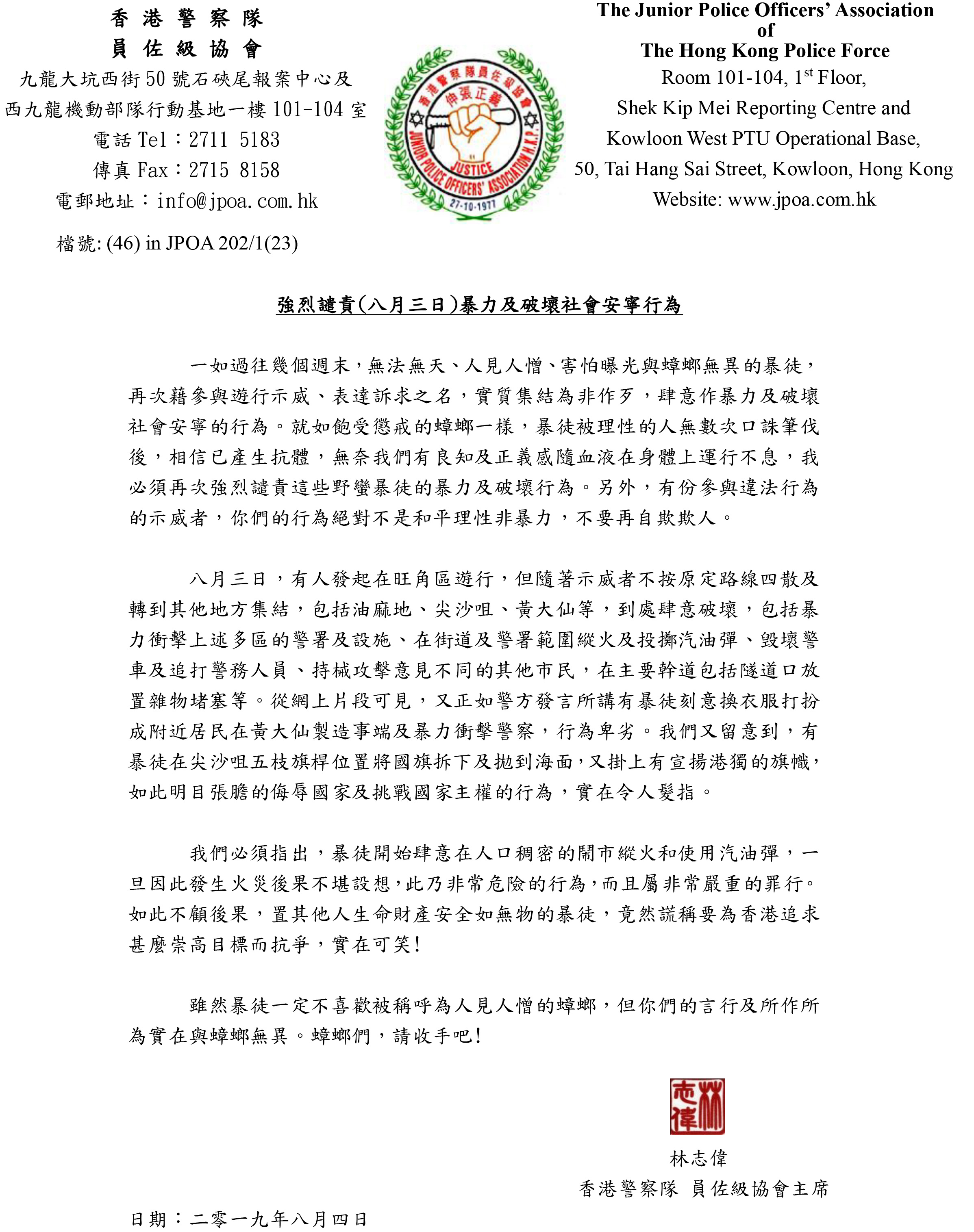 近日示威持續,不少人都希望為事件降溫,然而總有人在激烈的氣氛之下火上加油。警察員佐級協會今日(8月4日)發聲明,譴責昨日油尖旺及黃大仙一帶的示威行動,更形容示威者為「與蟑螂無異的暴徒」。