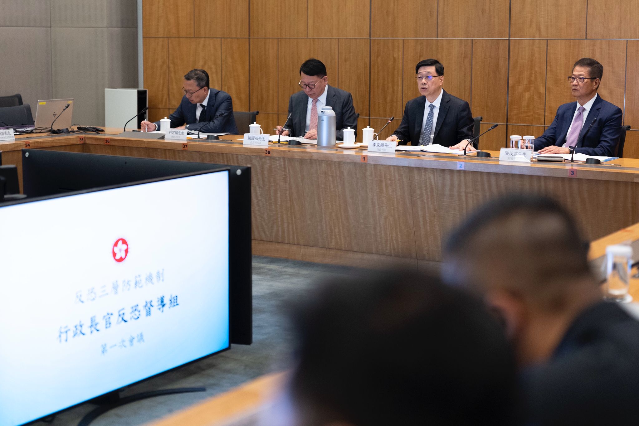 李家超表示,在去年《施政報告》提出引入「三層防範機制」,包括第一層(最高層)的「行政長官反恐督導組」,指導及制定反恐方針和策略;第二層的「保安局局長反恐統籌組」,協調各部門在反恐事宜上的合作;以及第三層的七個跨部門工作小組,跟進具體研究和執行反恐工作。今日舉行首次會議的「行政長官反恐督導組」由李家超擔任組長,政務司司長、財政司司長及律政司司長擔任副組長,多個政策局局長和部門首長出任成員。