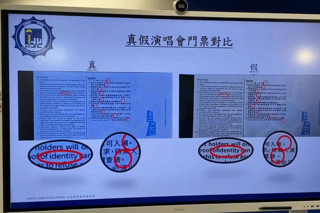 今次案件中檢獲的門票彷真度高,但仍有部分特徵可分辨假門票,例如假門票背後的銷售條款英文字句排版不整齊,某些字眼中間無分隔,而在中文條款中,標點符號的間距亦明顯比真門票闊。