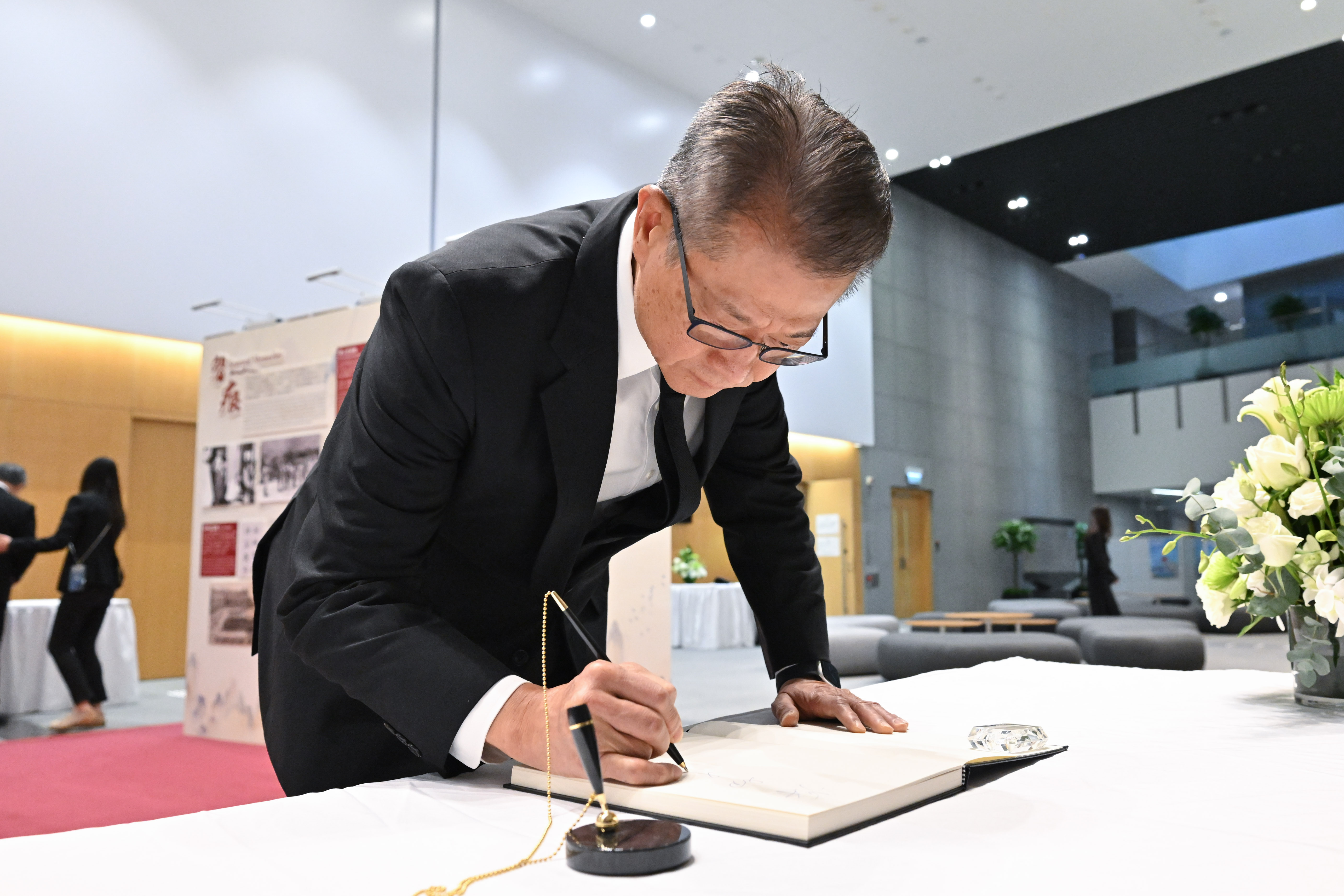 昨天早上在政府總部東翼前地,政府舉行了默哀儀式,哀悼在大埔宏福苑火災不幸罹難的市民,所有政府建築物也下半旗誌哀。民政事務總署在十八區的弔唁處,相繼有市民到來簽署弔唁冊。財政司司長陳茂波表示,大家都以不同方式表達對罹難者的深切悼念,他指這份哀慟傷痛,貫穿了整座城市。