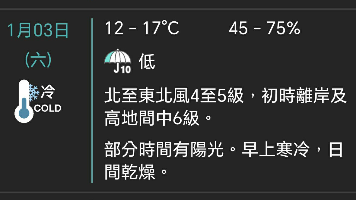 根據天文台九天天氣預告,下周六(1月3日)市區最低氣溫為12度,為入冬以來首度有機會達到寒冷水平。
