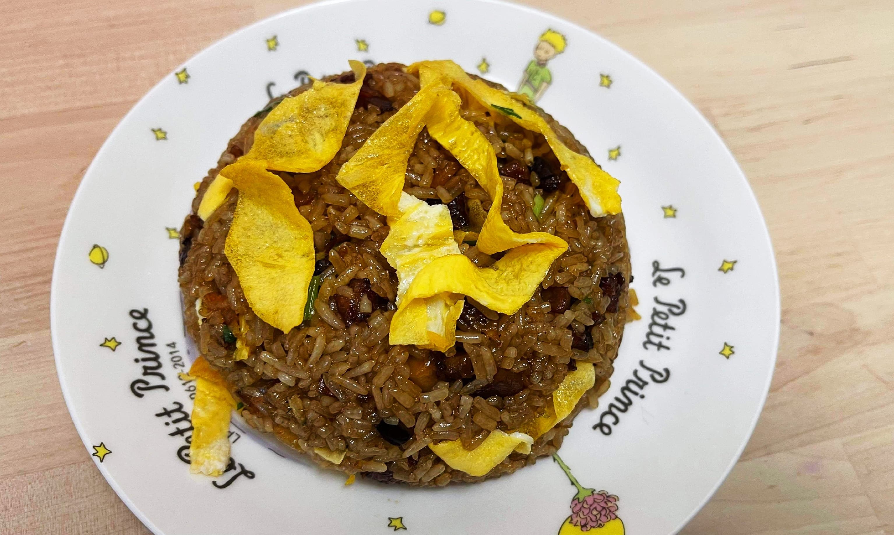 10.加入糯米,快速翻炒至臘味油脂包裹每粒糯米粒。