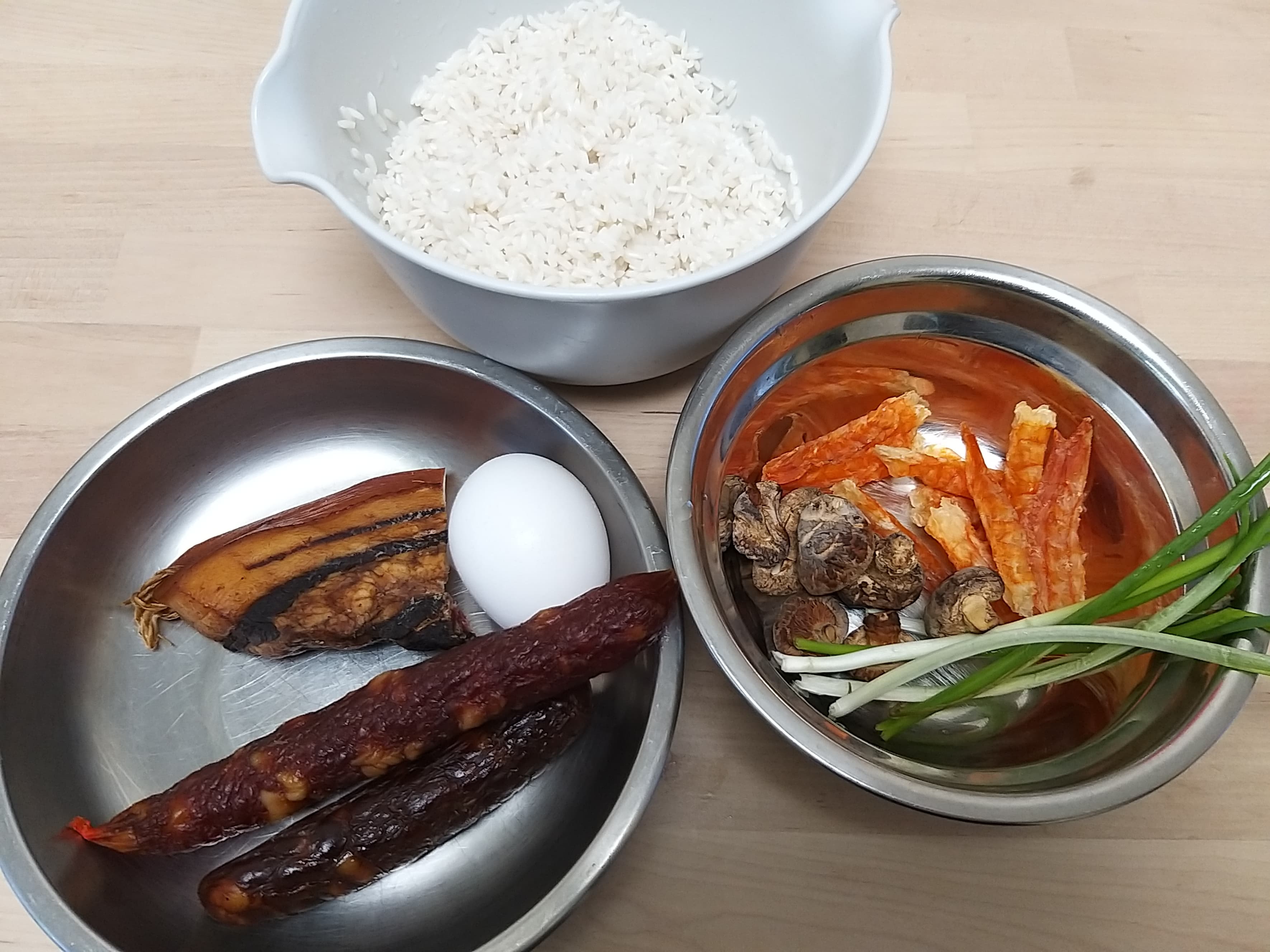 材料:糯米、臘肉、臘腸、潤腸、冬菇、蝦米、雞蛋、蔥粒