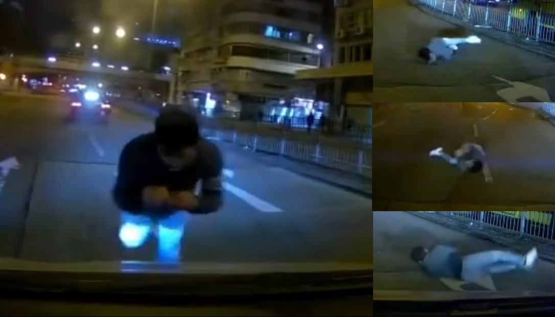 片段顯示,該片拍攝於今日凌晨2時許,事發地點為亞皆老街往九龍城方向,一名「撞車黨」突然撲向肇事車輛,人車觸碰之後,車上傳出尖叫聲,該男子就於路面不斷碌,碌了兩分鐘。