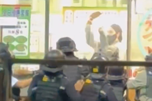 網上流傳影片,見到上水一間牛雜麵店內,有一名女子持菜刀與多名持盾的警員對峙,期間女子更砍向警員盾牌。