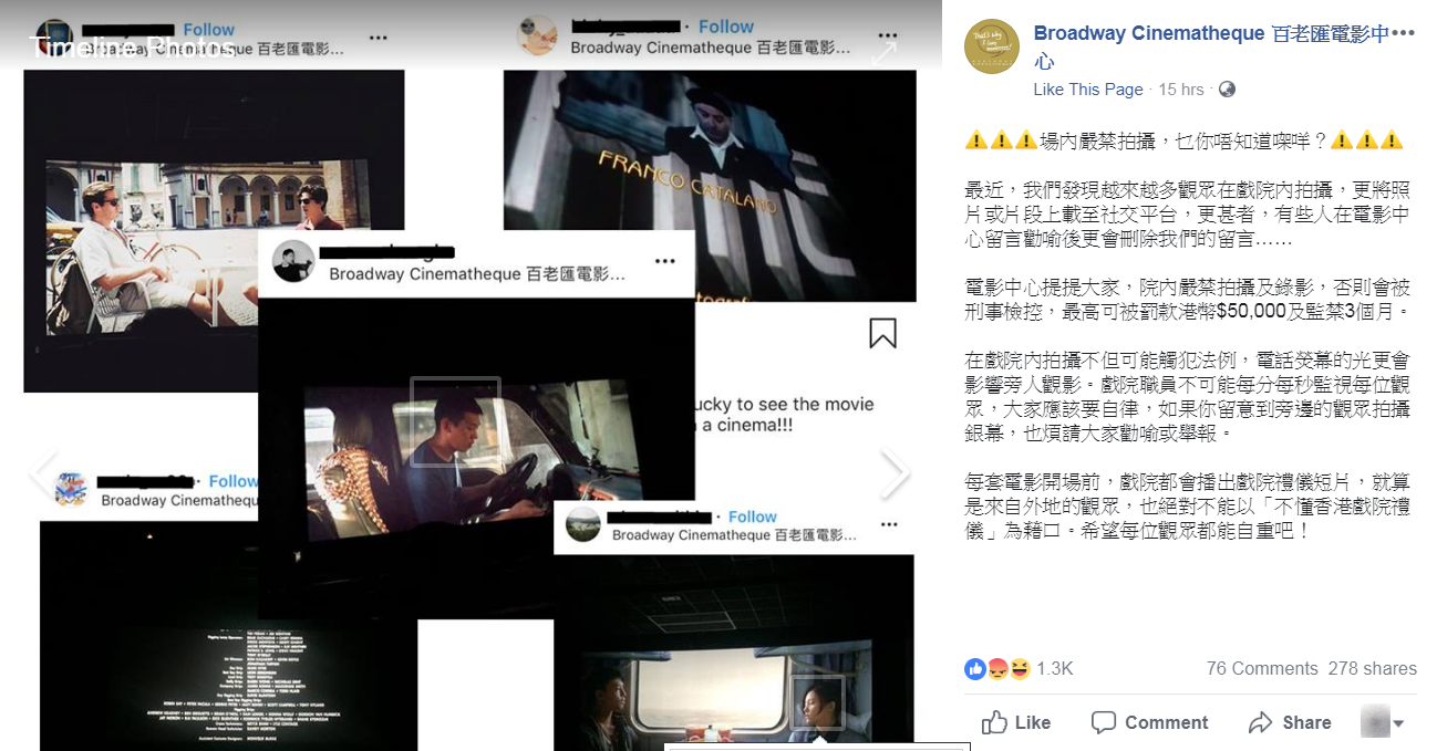 百老匯電影中心昨日在其Facebook專頁發帖,提醒觀眾在戲院內拍攝及錄影屬違法。電影中心指最近發現越來越多觀眾在戲院內拍攝,更將照片或片段上載至社交平台,甚至有些人在電影中心留言勸喻後,刪除他們的留言。