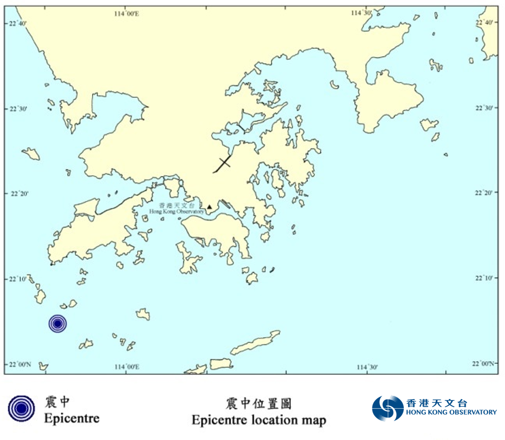 據香港天文台的初步分析,中國東南部近岸發生一次 3.4級地震,震央位於北緯22.08度,東經113.86度附近,即香港天文台之西南約41公里。