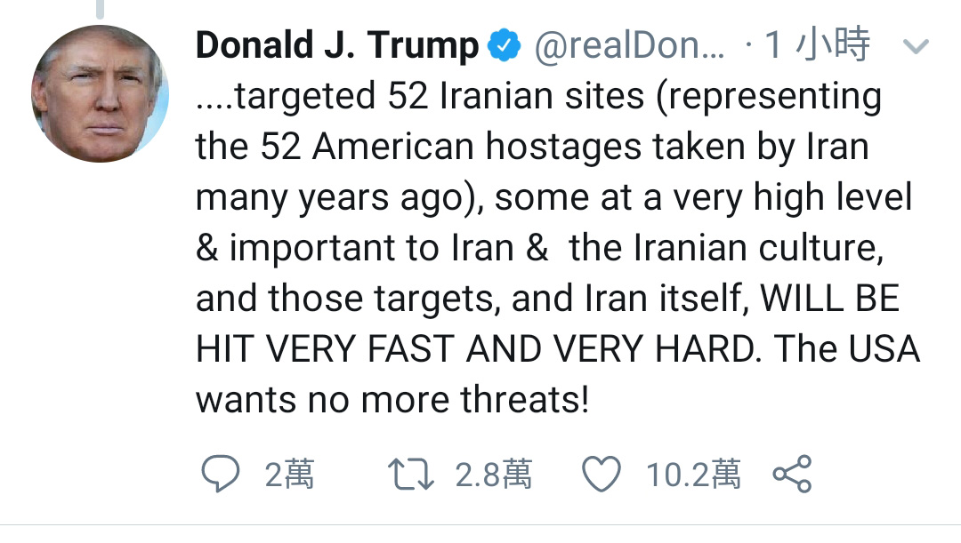 其中一些目標對伊朗和伊朗文化非常重要,這些目標將會受到非常迅速和嚴厲的打擊。特朗普又說,美國不想要更多的威脅。