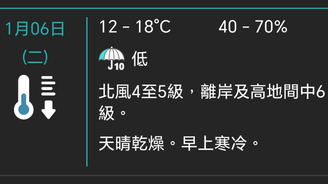 天文台表示,冬季季候風會在今日(1月5日)稍後逐漸影響廣東沿岸地區,本港晚間天氣轉冷,明日(1月6日)早上市區最低氣溫會在12度左右。