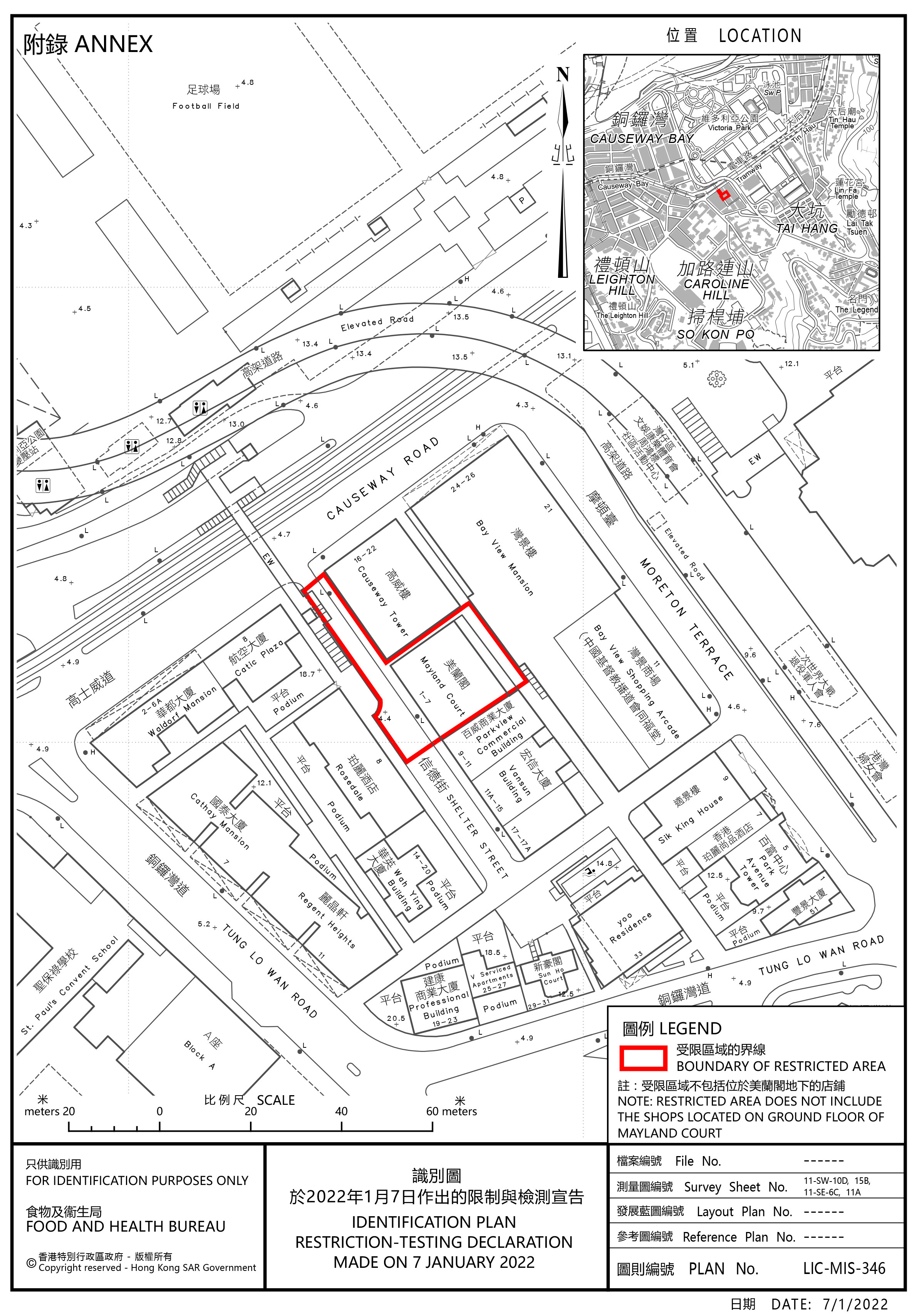 政府今日(1月7日)引用《預防及控制疾病(對若干人士強制檢測)規例》(第599J章),作出限制與檢測宣告,自晚上9時起限制在銅鑼灣指明「受限區域」,即銅鑼灣信德街1-7號美蘭閣,不包括位於美蘭閣地下的店舖內的人士,須留在其處所並接受強制檢測。受檢人士須在其處所等候,直至「受限區域」內所有已識別的受檢人士完成檢測,而相關檢測結果亦已獲大致確定,方可離開其處所。政府目標是在明日(1月8日)上午約7時完成此行動。