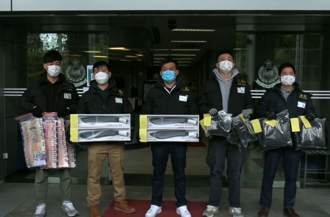 行動中警方在牛頭角一單位內檢獲5把牛肉刀、約86克懷疑霹靂可卡因及一批毒品包裝工具。