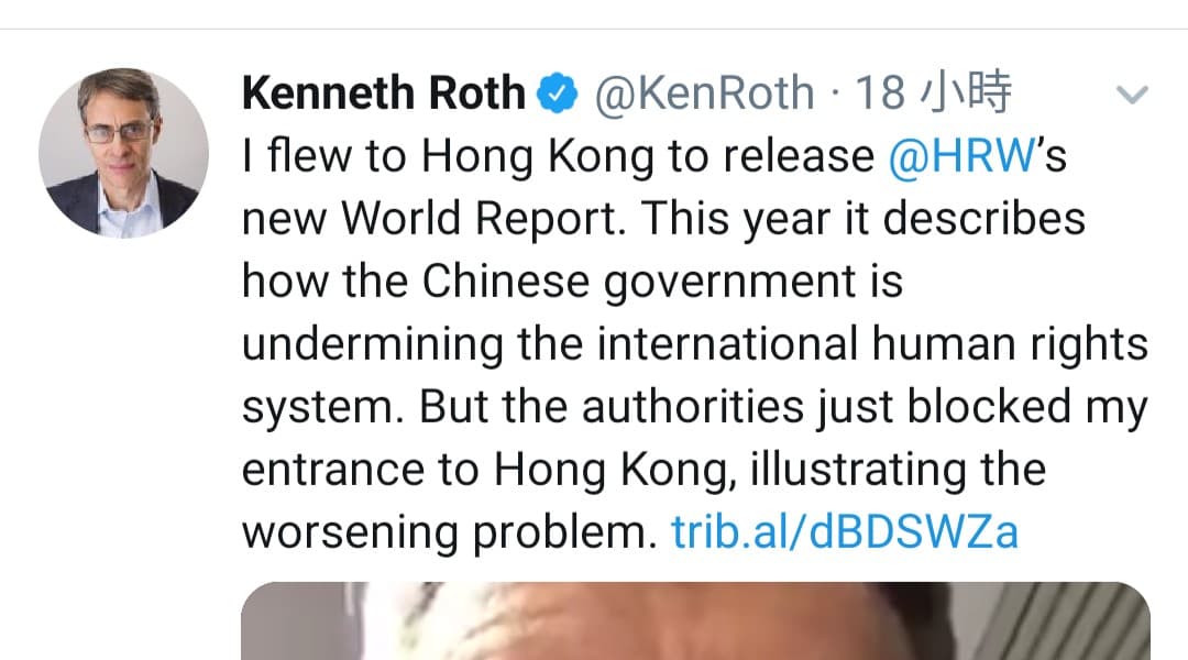 「人權觀察」(Human Rights Watch)執行長Kenneth Roth,昨晚(1月12日)由紐約飛抵香港時被拒入境。