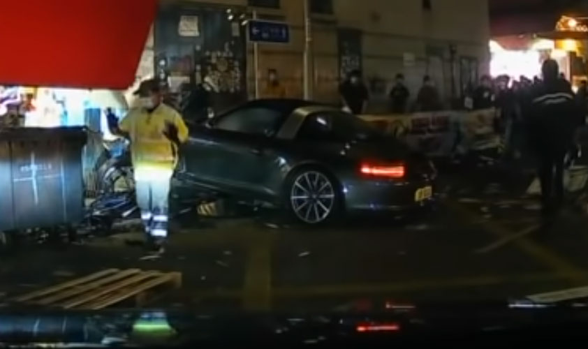 事發於在昨日傍晚6點半,肇事私家車於元朗合財街先倒車時撞到另一架私家車,再向前高速行駛時,撞向一輛裝滿瓷磚的唧車,之後衝向行人路,撞到欄杆及路牌。5名途人被瓷磚碎片擊中或閃避時受傷,幸均無生命危險。