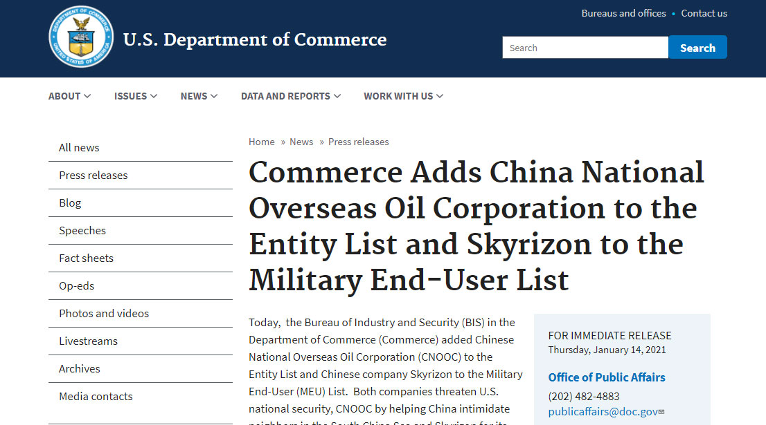 美國商務部周四(1月14日)公布,把中國海洋石油(CNOOC)列入實體清單,並將中國公司北京天驕(Skyrizon)列入與軍事活動有聯繫的實體清單。