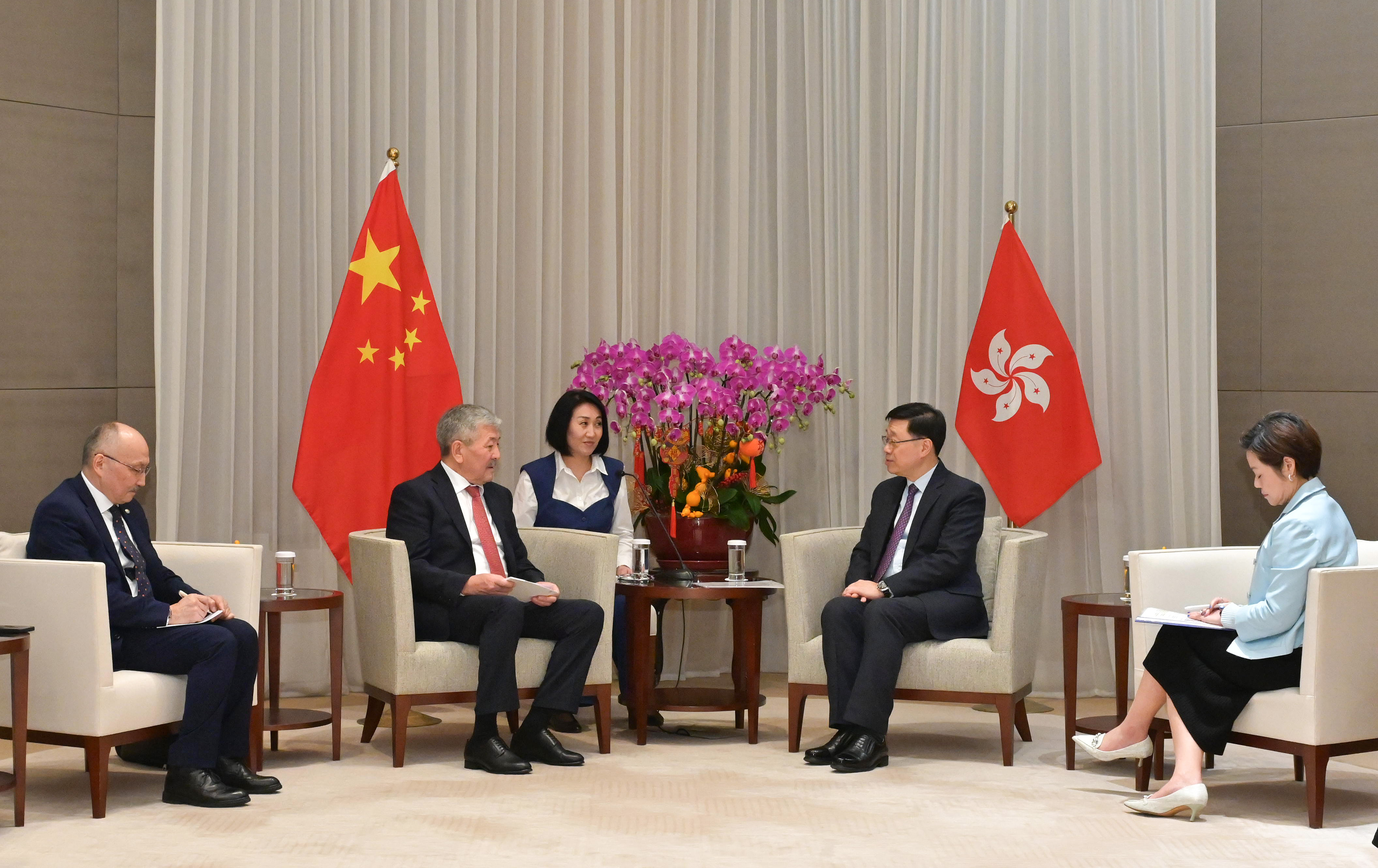 李家超今日下午與吉爾吉斯共和國內閣主席兼總統辦公廳主任Adylbek Kasymaliev會面。李家超指出,香港在「一國兩制」下擁有背靠祖國、聯通世界的獨特優勢,是國際金融、航運、貿易中心,一直匯聚多元化的資金來源、國際企業和專業人才;吉爾吉斯共和國增長強勁,發展潛力龐大。他歡迎吉爾吉斯共和國善用香港作為主要融資中心、可持續金融樞紐和全球離岸人民幣業務樞紐的優勢,通過來港籌集可持續發展資金和發行人民幣債券,開拓海外和內地市場,推動金融創新。香港全力與吉爾吉斯共和國等共建「一帶一路」國家加強合作,互惠共贏,支持區域可持續發展。