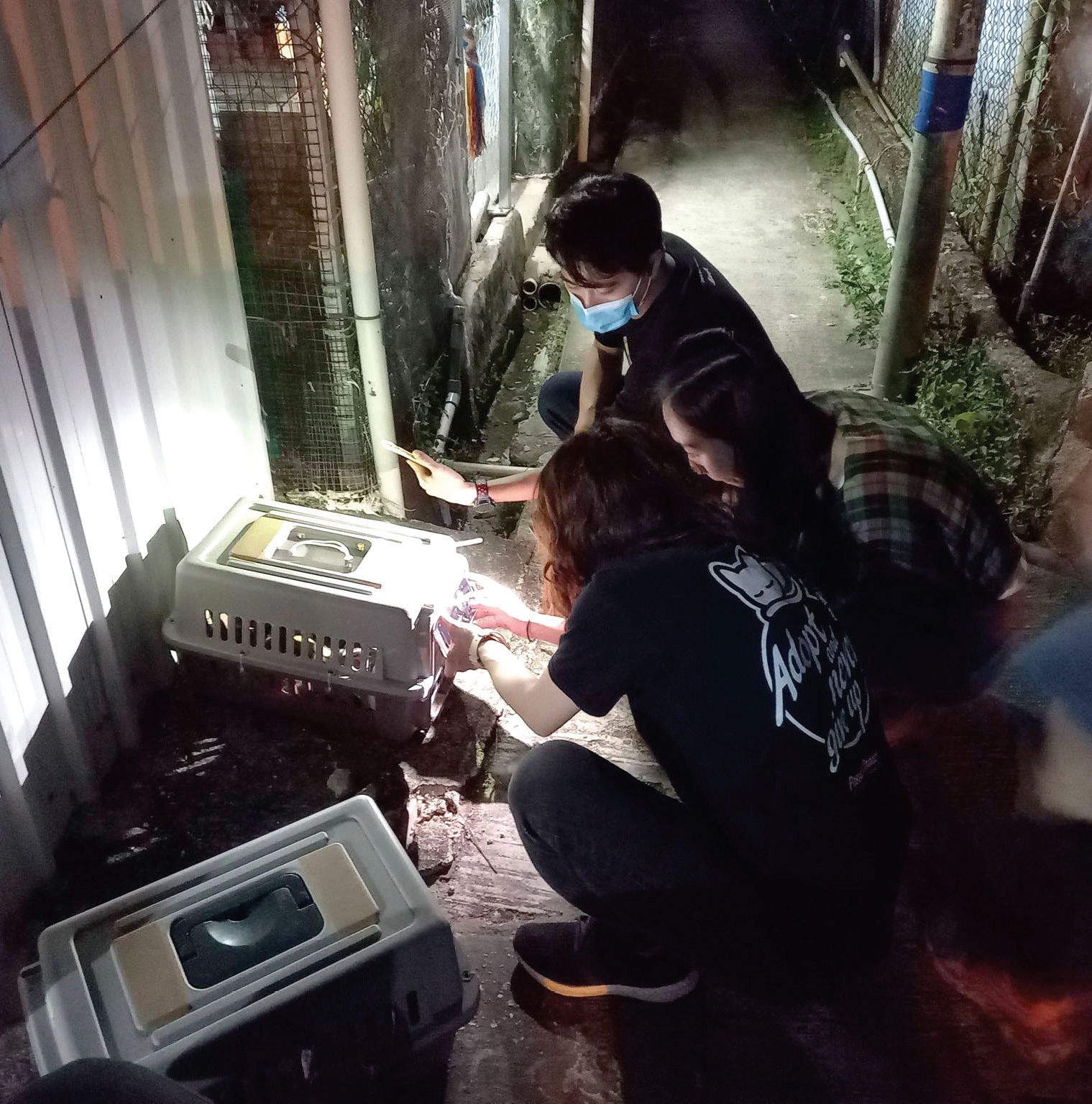到達地點後,我們立即在暗角設置幾個貓籠,靜候波仔出現。在等待過程中,得知原來義工早於一星期前,每日視察並嘗試與波仔建立關係,及後才計劃今次行動,務求一擊即中 - 若波仔洞悉捕貓籠是個「陷阱」,牠以後都不會再「中計」;往後就可能要用網或布去捕捉,但考慮到波仔前肢受傷變型,深怕若用網捕捉波仔會令牠掙扎受傷。