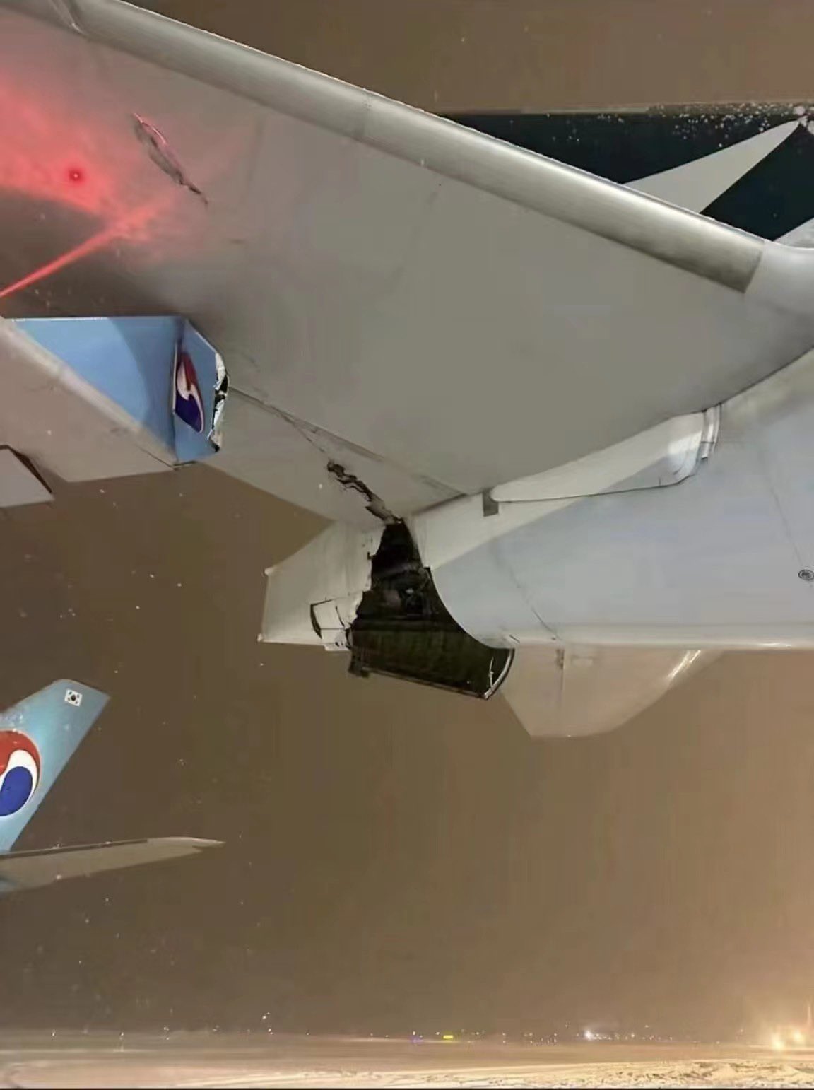 消防表示,應是移動中的大韓航空航機左側機翼,跟靜止中的國泰航空航機垂直尾翼發生碰撞。