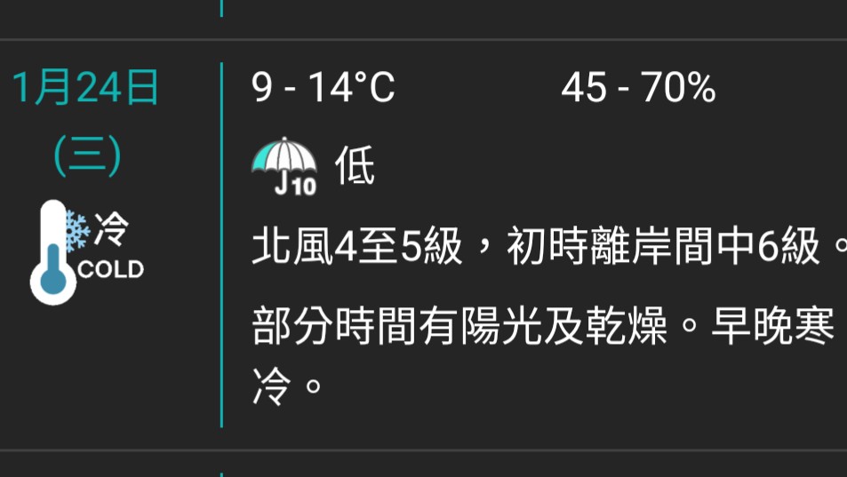 根據天文台最新九天天氣預報,下周二(1月23日)有一兩陣雨,市區最低氣溫10度,下周三市區更會低見9度。