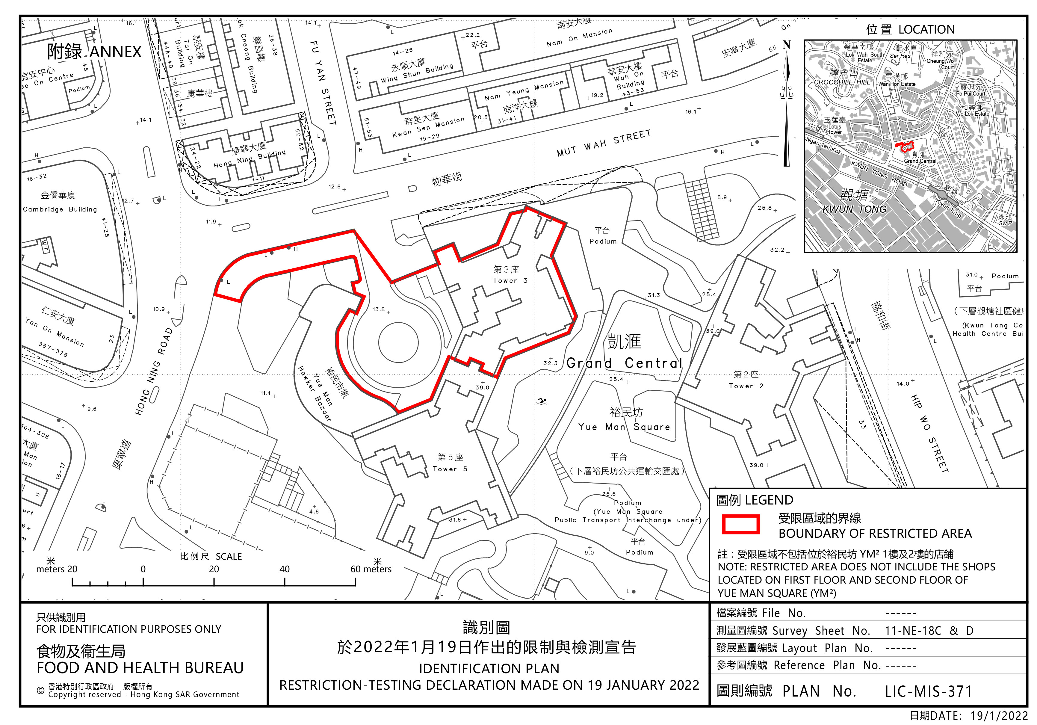 政府今日(1月19日)引用《預防及控制疾病(對若干人士強制檢測)規例》(第599J章),作出限制與檢測宣告,自傍晚6時30分起限制在觀塘指明「受限區域」,即觀塘協和街33號凱滙第3座,不包括位於裕民坊(YM²)1樓及2樓的店鋪內的人士,須留在其處所並接受強制檢測。受檢人士須在其處所等候,直至「受限區域」內所有已識別的受檢人完成檢測,而相關檢測結果亦已獲大致確定,方可離開其處所。政府目標是在明日(1月20日)上午約6時30分完成此行動。