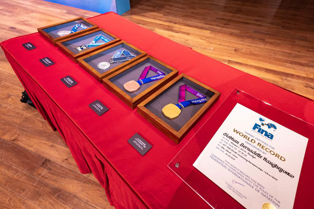同場亦展示何詩蓓於5個重要賽事的獎牌,包括她的首個國際游泳賽事獎牌——世界青少年游泳錦標賽金牌,東京奧運銀牌﹑亞運獎牌及世界游泳錦標賽銀牌等。