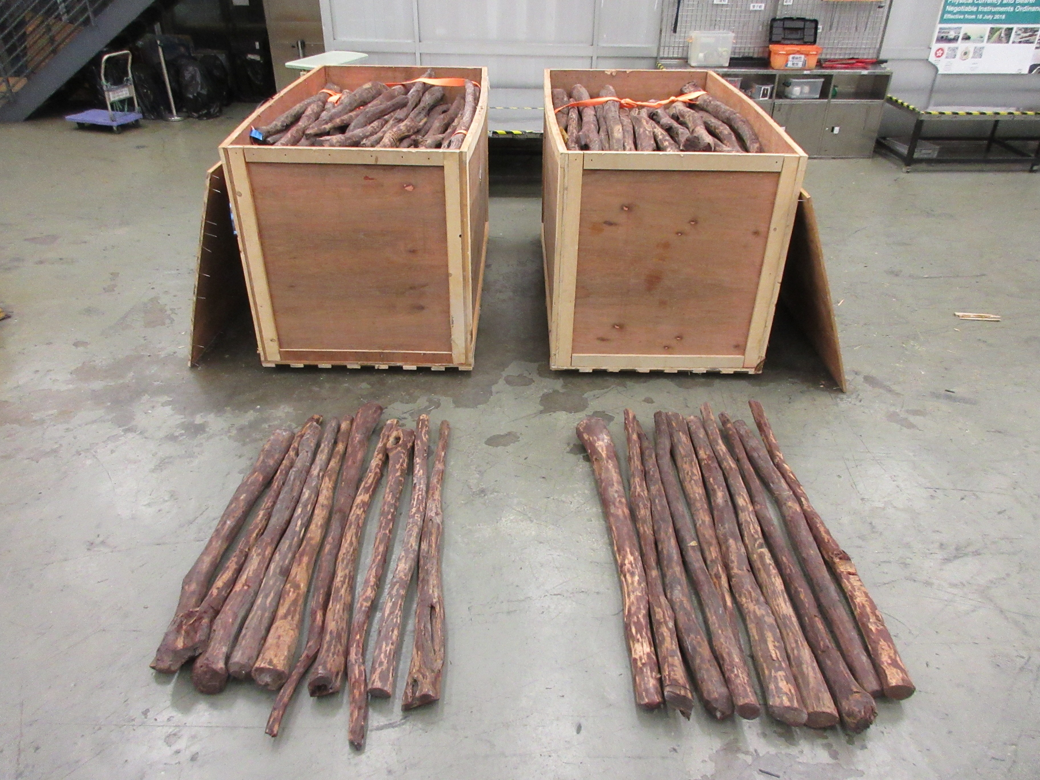 海關人員今日透過風險評估,檢查一批從杜拜抵港並報稱載有傢俬原材料的空運貨物。經檢查後,海關人員在兩個大木箱內發現該批懷疑受管制紫檀木材。