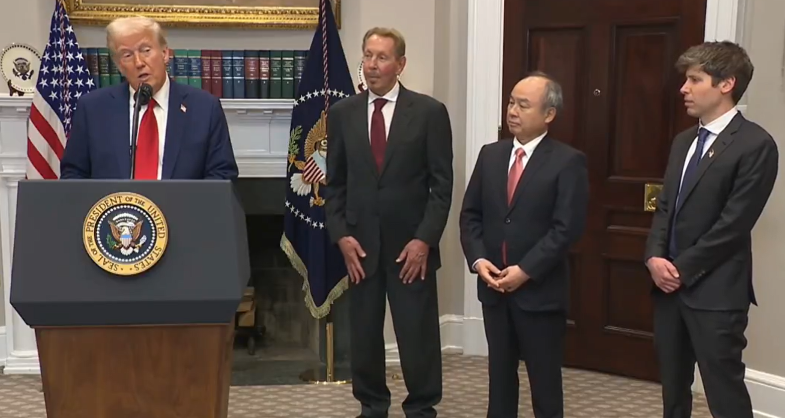特朗普聯同OpenAI行政總裁阿爾特曼,以及軟銀和甲骨文的高層,於白宮一同出席記者會,公布名為「Stargate」的計劃詳情。他指,投資涉及大型人工智能數據中心,將可為美國創造最少10萬個職位,又強調希望把人工智能產業保留在美國,他將通過動用緊急權力和行政命令來便利項目建設,其中包括能源支持。