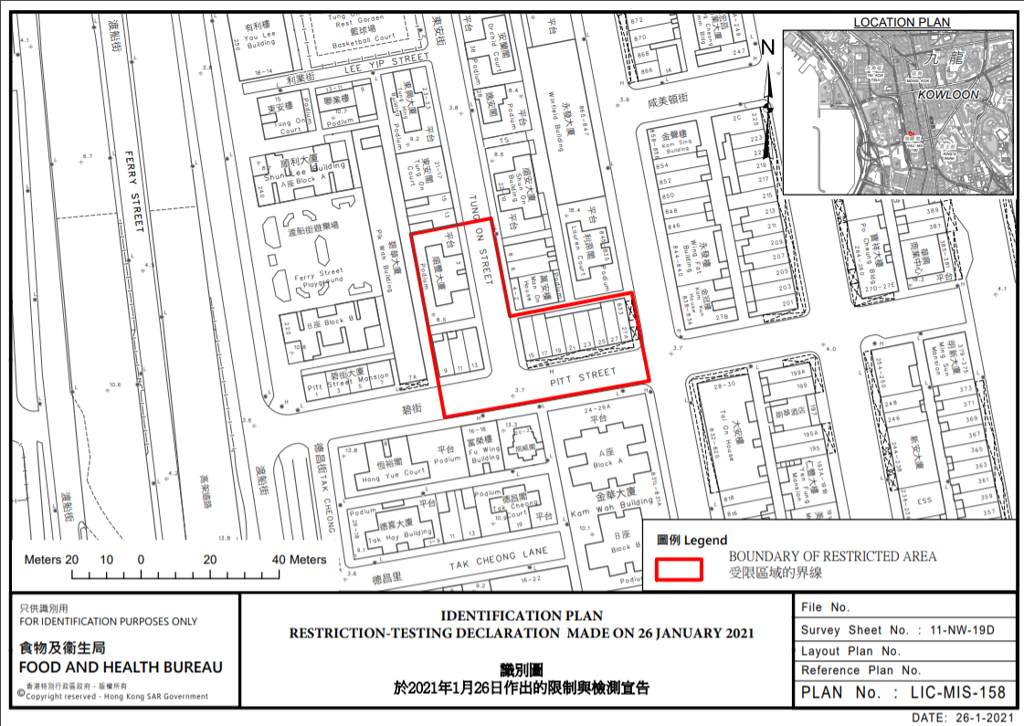 政府今晚(1月26日)突發引用《預防及控制疾病(對若干人士強制檢測)規例》(第599J章),作出限制與檢測宣告,自晚上7時起限制在油麻地指明「受限區域」(即碧街9-27號和東安街3號)內的人士須留在其處所並按政府安排接受強制檢測。受檢人士須在其處所等候,直至區內所有已識別的受檢人士完成檢測,而相關檢測結果亦已獲大致確定,方可離開其處所,政府目標是在明日(1月27日)上午6時左右完成此行動。