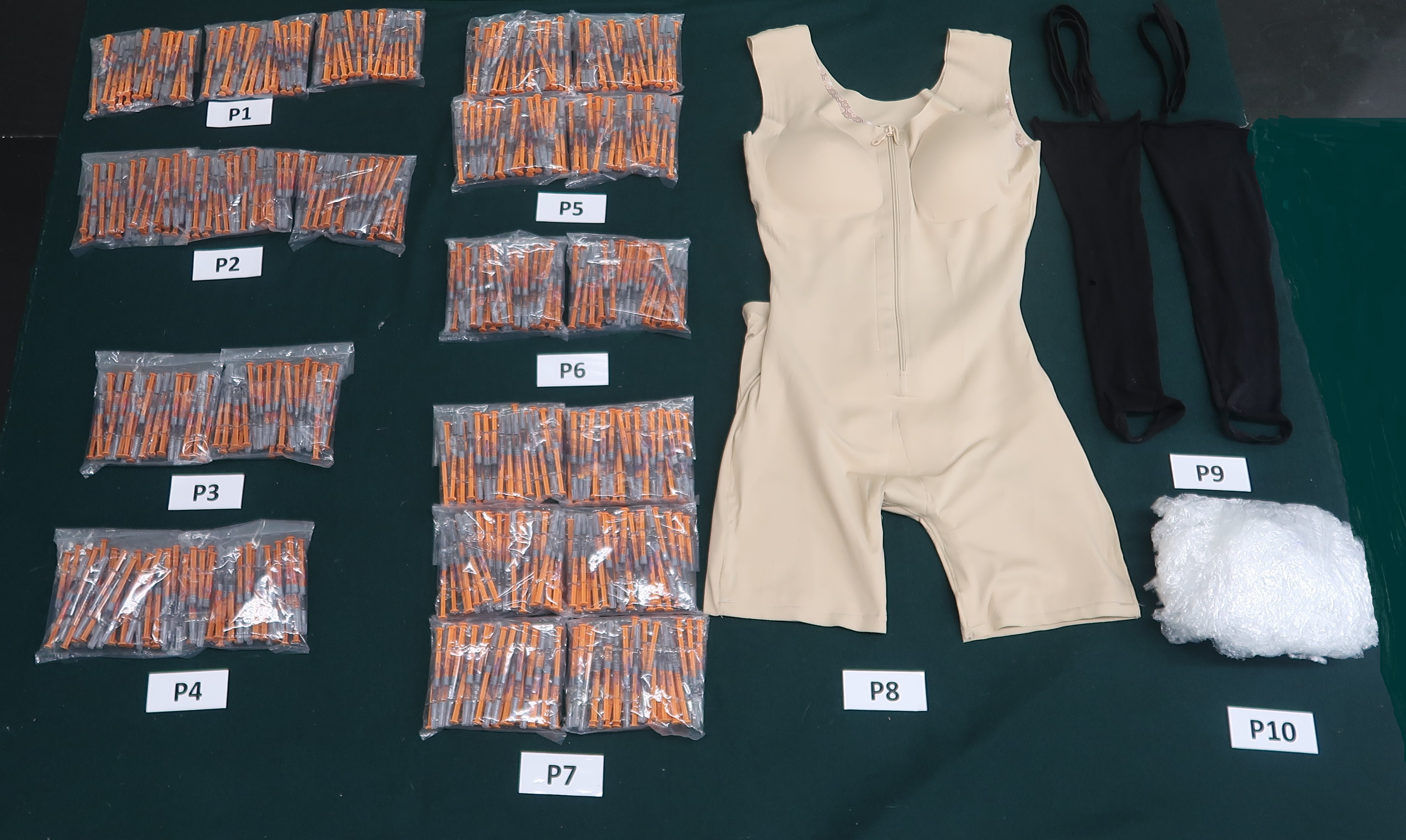 海關人員於上述日子在深圳灣管制站離境大堂截查一名55歲女旅客,經檢查後發現她將該批藥物針劑分別收藏於腰間及腿部,並以衣服作遮掩。