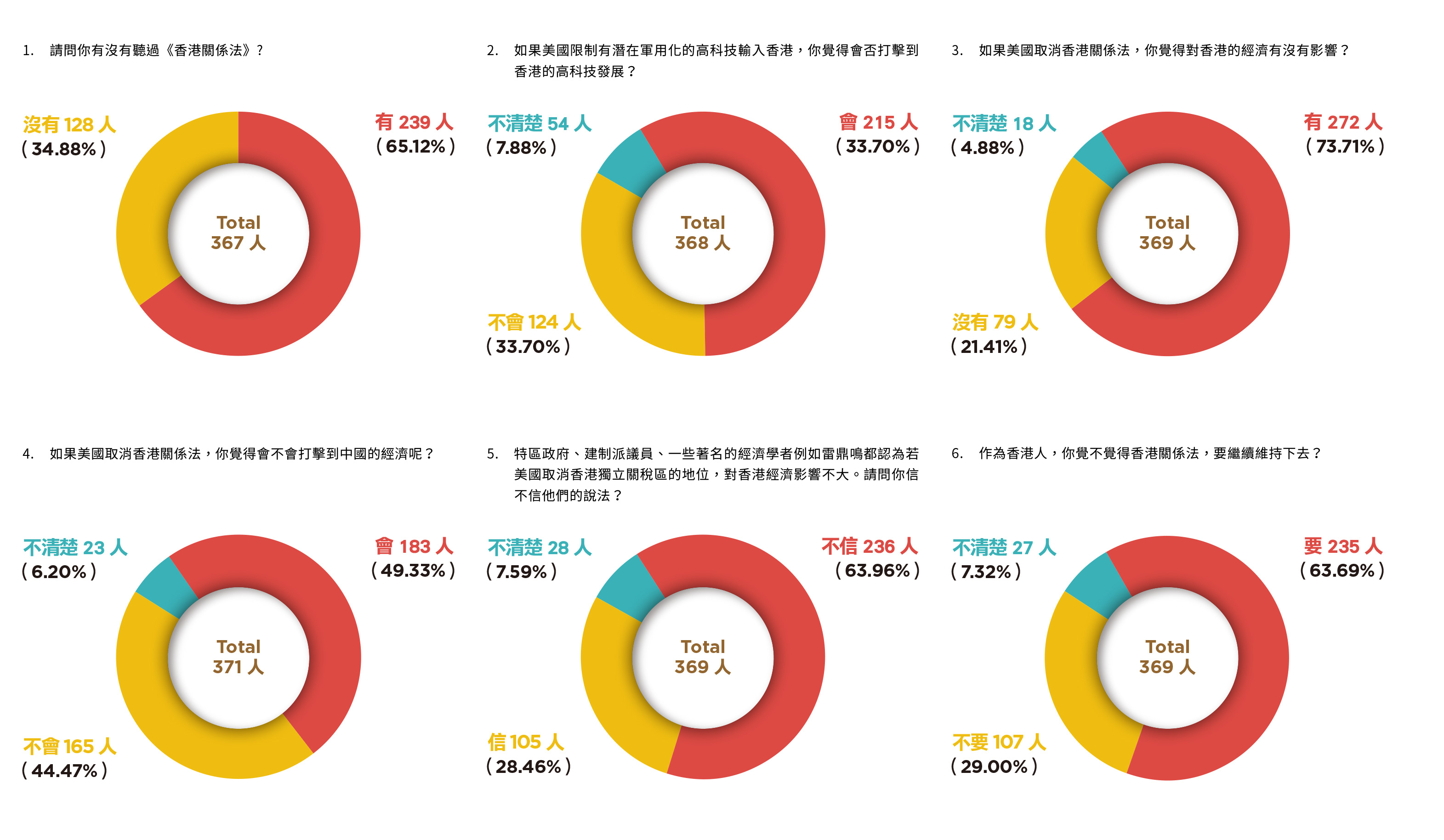 不過,當問到如果美國取消《香港關係法》會否打擊中國經濟時,雙方人數相當接近。有近五成人認為會打擊中國經濟(183人,49.33%),認為不會的則有近四成半(165人,44.47%),不清楚的則不足一成(23人,6.20%)。可見如果中美關係持續惡化,一旦取消《香港關係法》,對中國影響不容忽視。