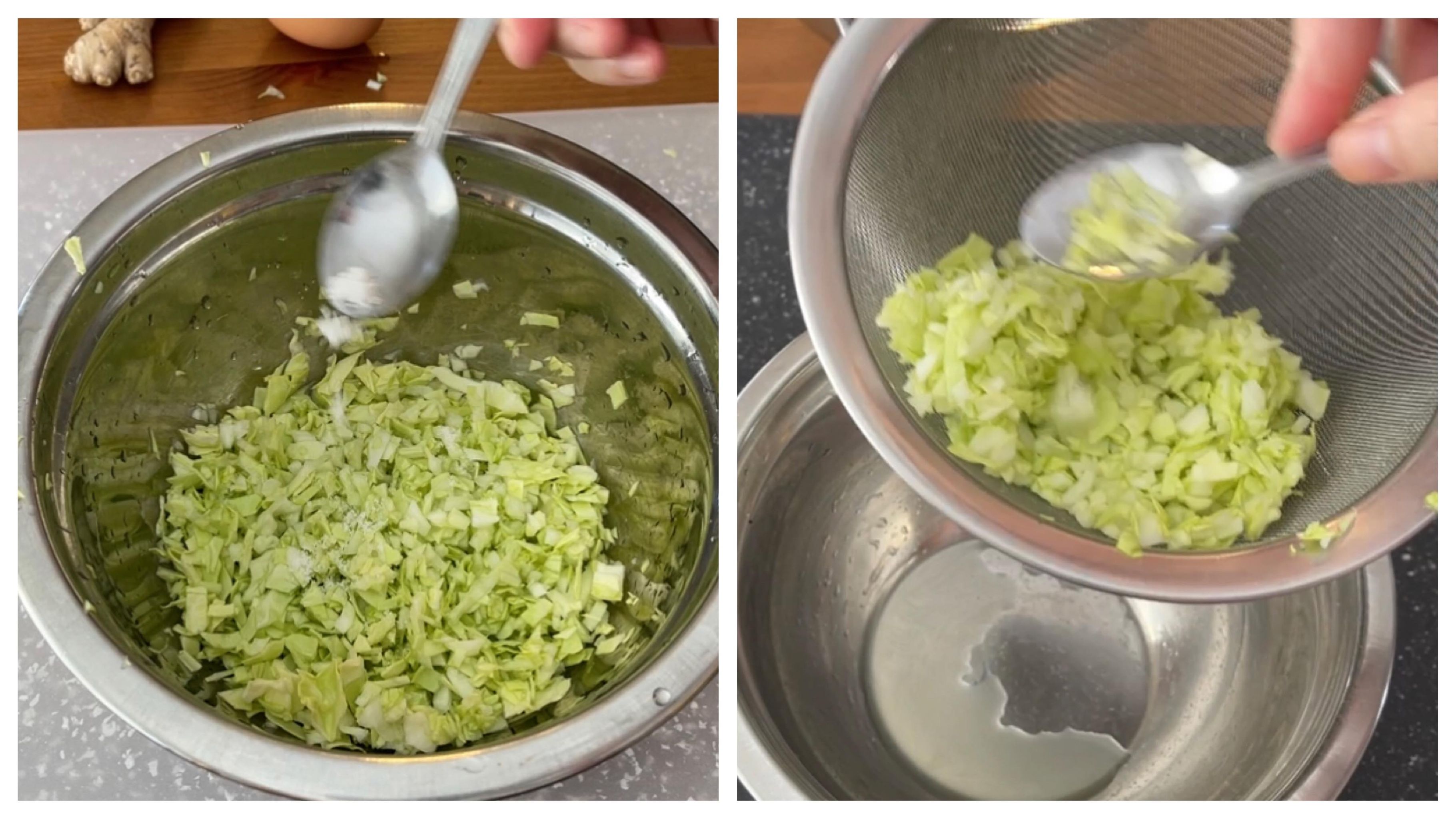 (2)高麗菜切粒,落少許鹽使出水和去走菜青味,隔去水份。