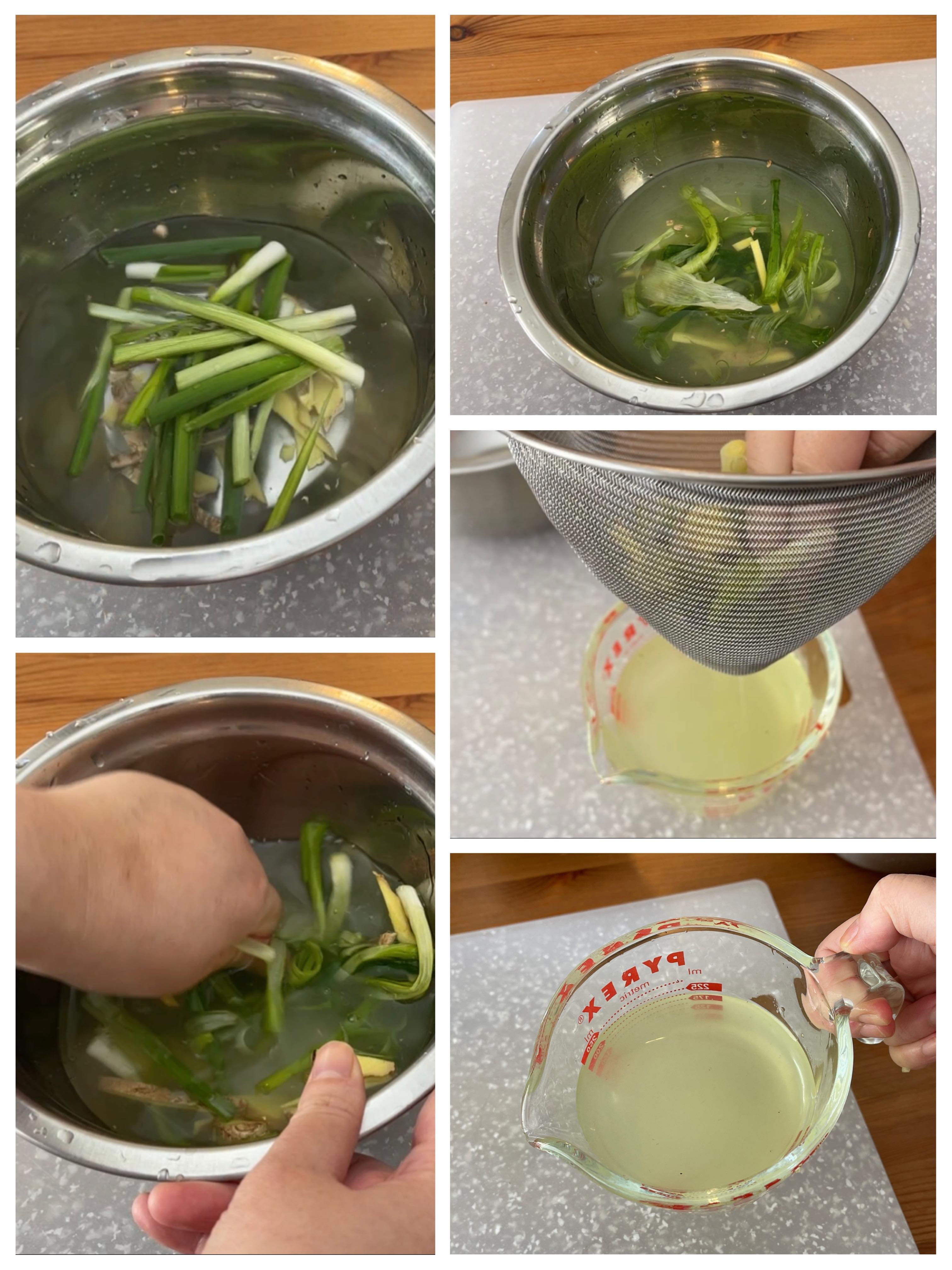 (1)先做薑蔥水;將薑蔥放入水中,用手搓出味,過篩後成薑蔥水。