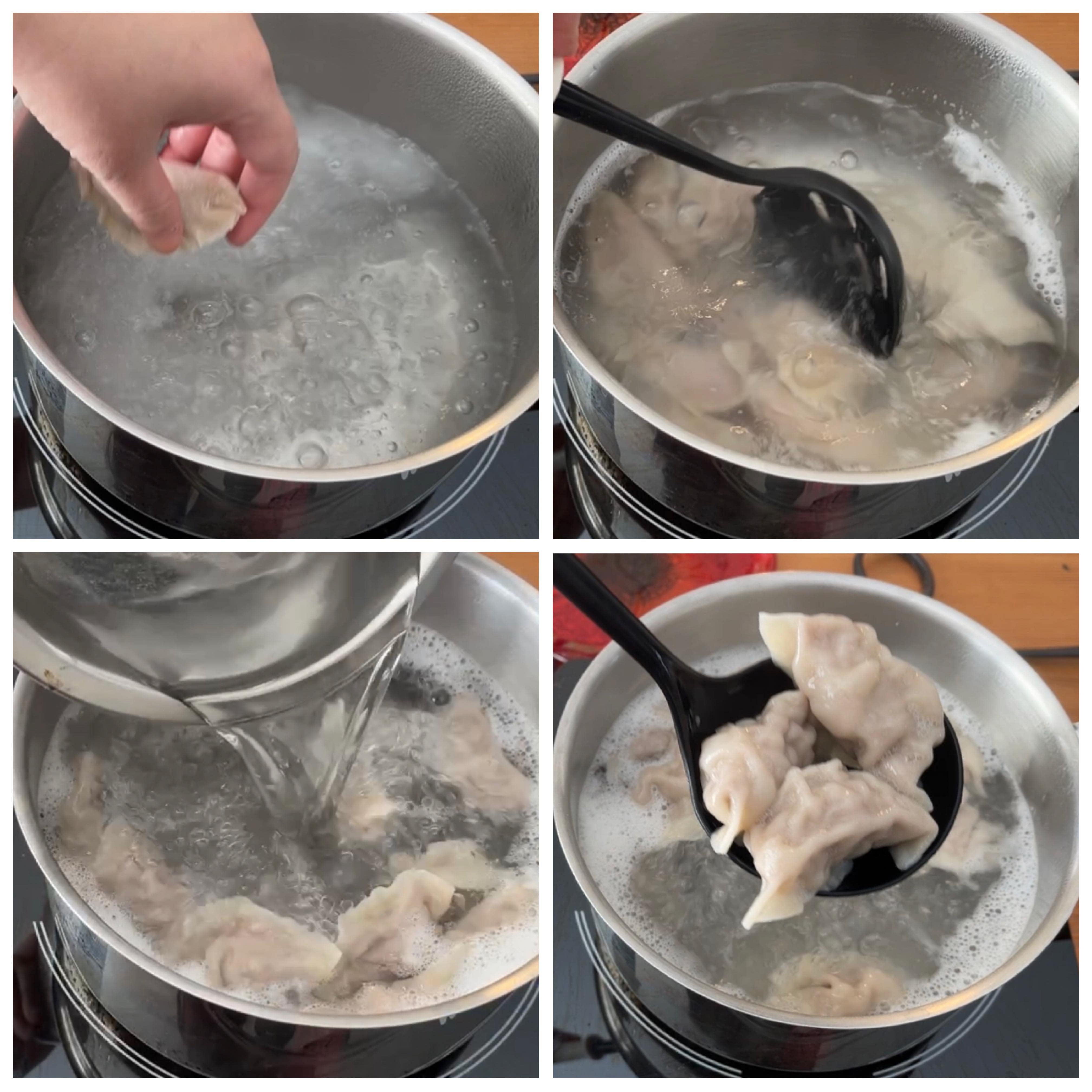 (5)煮水餃:將水煮滾放少許鹽,落水餃,中火煮至滾起隨即加一小杯凍水,再待煮滾後再加一次一小杯凍水,最後煮滾水餃亦浮起即可撈起食用。