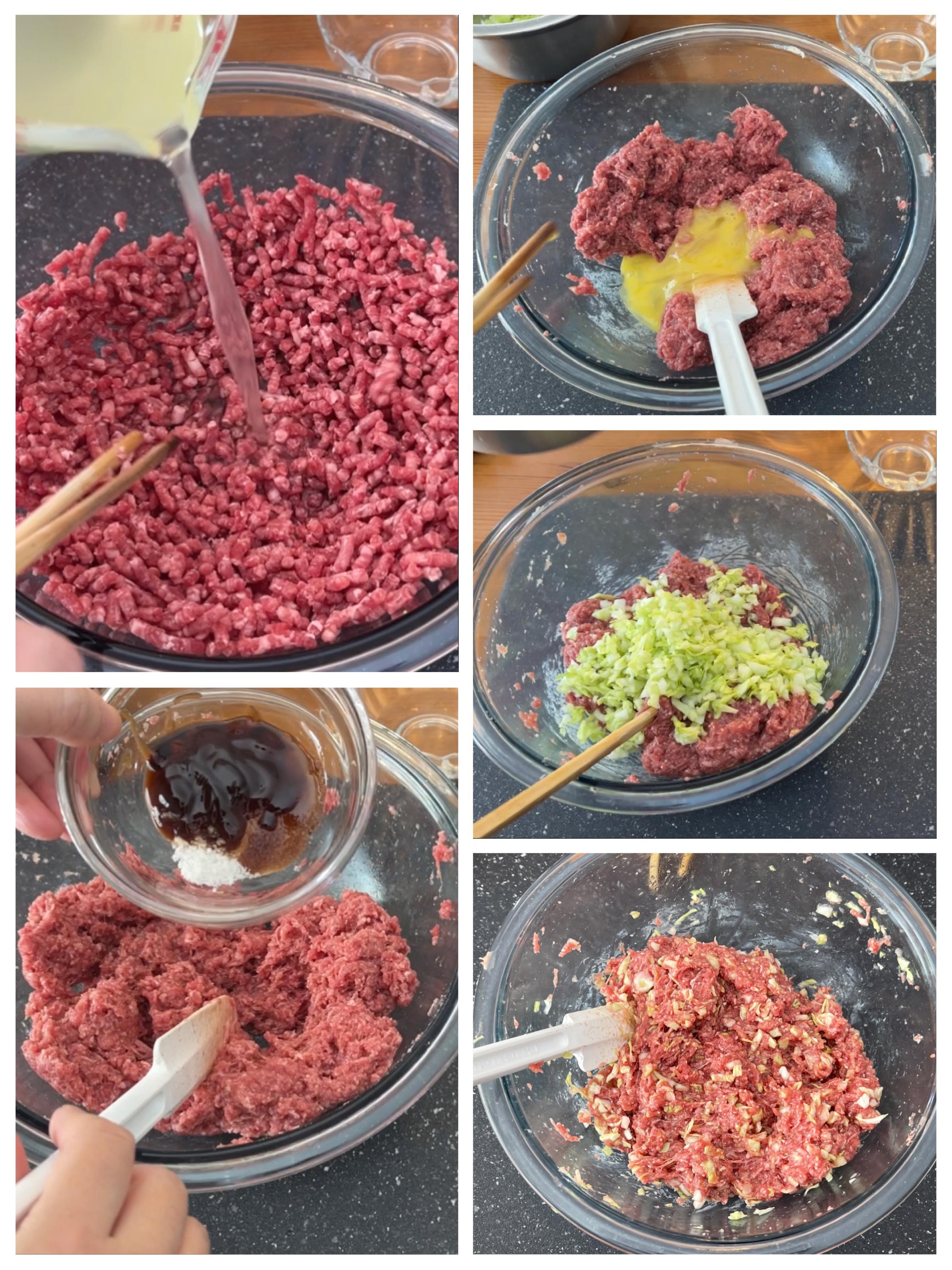 (3)將豬肉放入盆中,分次逐少加入薑蔥水,不斷攪拌至感覺起膠,加入調味料繼續攪,加入蛋和菜,攪至完全融合即可,可以放入雪櫃30分鐘才包。