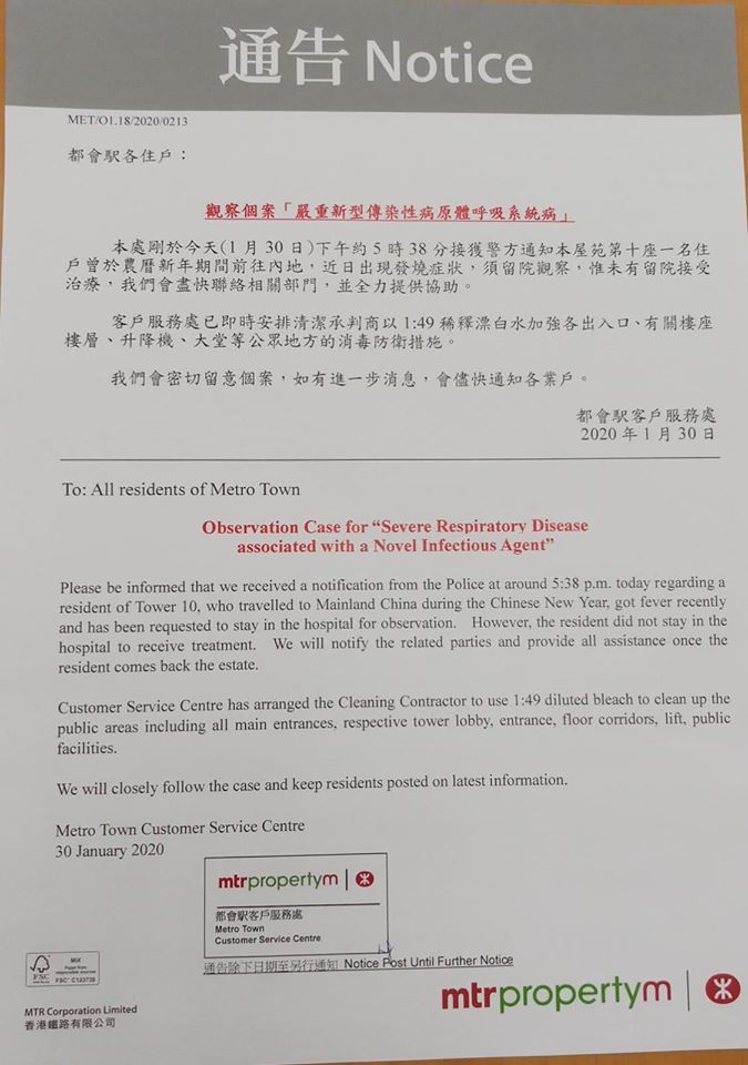 都會駅客戶服務處發出通告,指今午約5時半接獲警方通知,屋苑第十座一名住戶曾於農曆新年期間北上,近日出現發燒症狀,須留院觀察,惟未有留院接受治療。服務處會盡快聯絡相關部門,並全力提供協助。