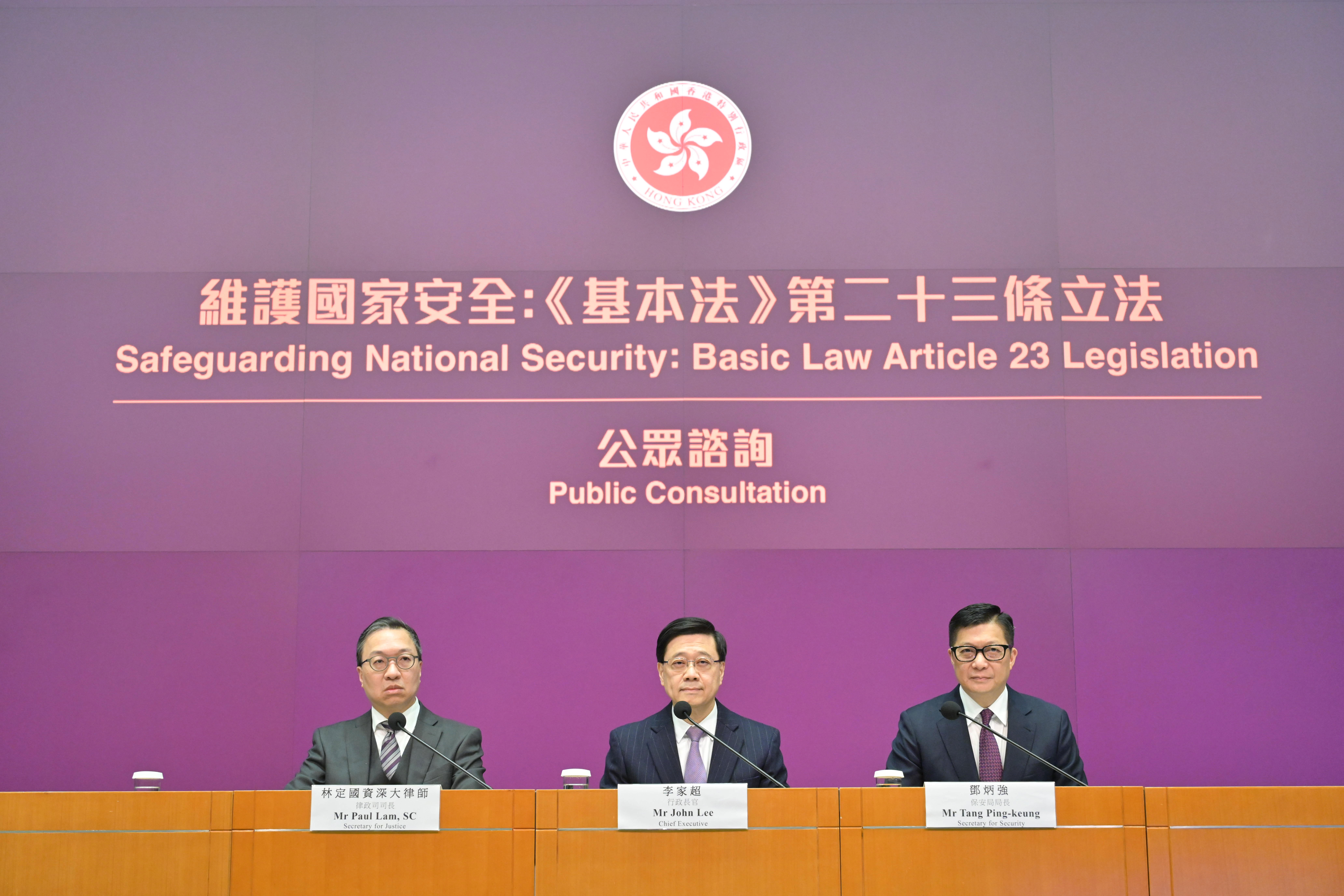 政府今早10時舉行「維護國家安全:《基本法》第二十三條立法公眾諮詢」記者會,由行政長官李家超主持,律政司司長林定國和保安局局長鄧炳強亦會出席。李家超說,23 條的立法原則包括維護一國兩制方針、國家主權,亦會秉持「尊重和保護人權」原則,包括依法保護《基本法》訂定和聯合國《公民權利和政治權利國際公約》的權利,包括言論、新聞、結社自由等。