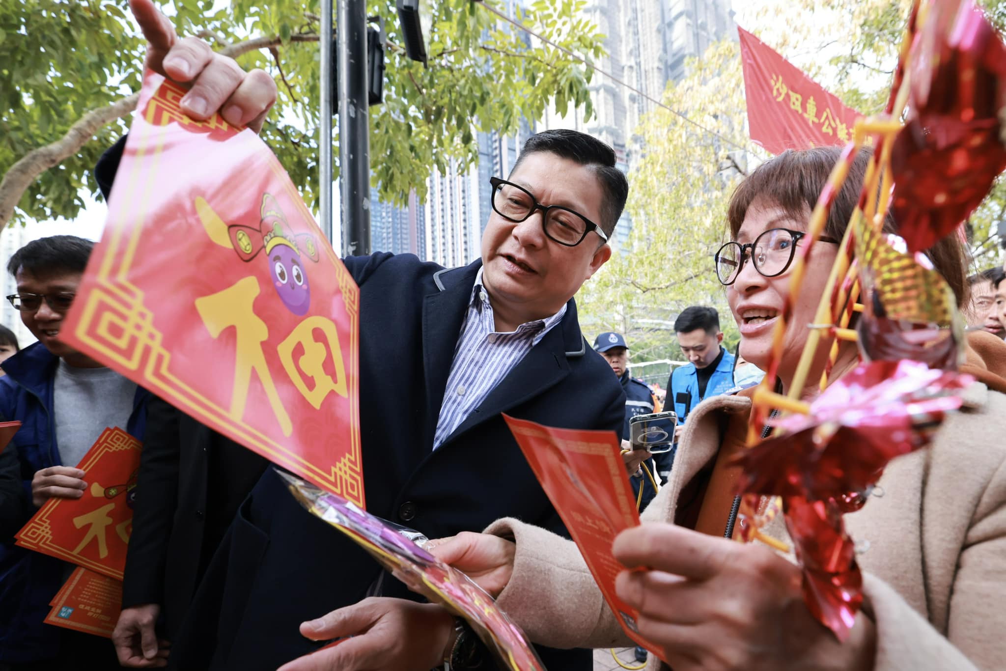 適逢今日車公誕,人流駱驛不絕,他感謝警隊、民安隊及醫療輔助隊的同事專業執勤。他又去轉銅風車,去市集買風車及平安葫蘆掛飾,祝福香港風調雨順、百業興旺。
