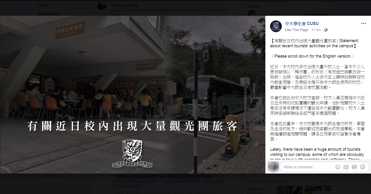 中大學生會昨晚在其Facebook專頁表示,發現近日中大校園內出現大量校外人士,不少更是有旅遊巴接載及穿上統一服飾之「鴨仔團」旅客。有關人士多次在上課時段在飯堂用膳,又乘搭校巴,嚴重影響師生日常校園活動。