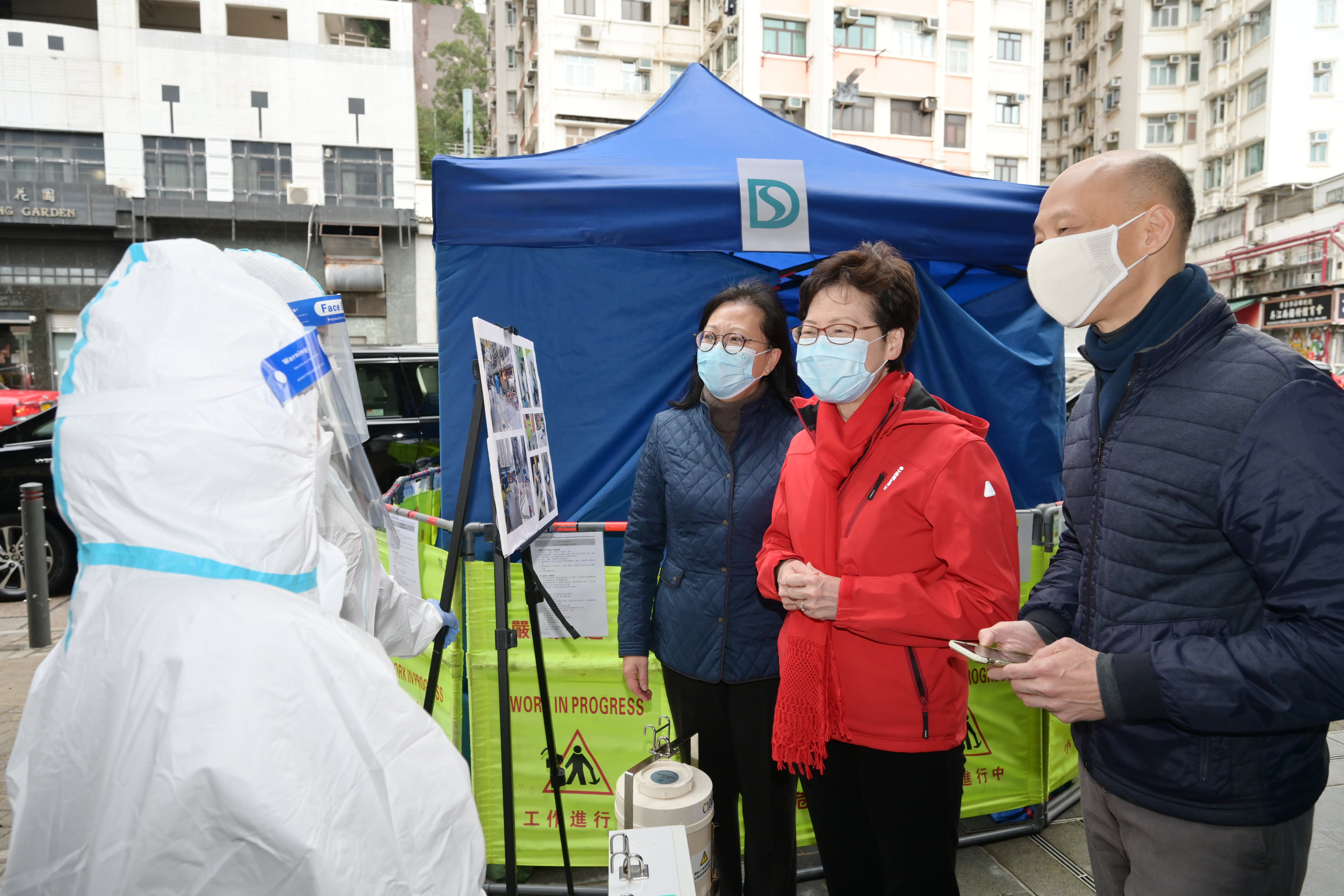 林鄭月娥在張翔教授陪同下順道視察港大計劃在薄扶林興建科研大樓的用地和聽取項目進展。隨後,林鄭月娥在署理民政事務局局長陳積志、民政事務局常任秘書長黃智祖和署理民政事務總署署長王秀慧陪同下到觀塘社區中心,探訪逾100位參與包裝快速測試套裝的義工。