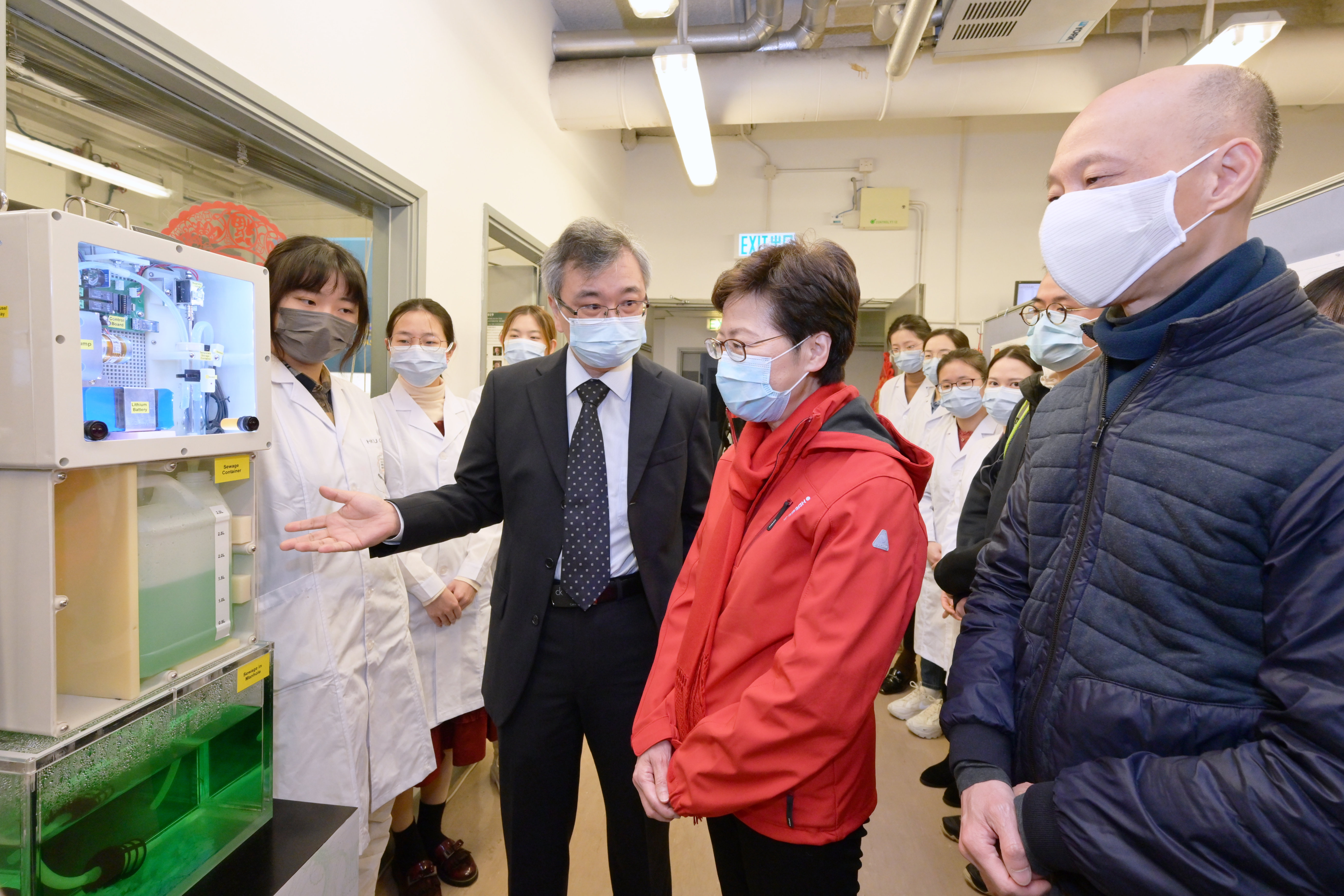 林鄭月娥一行接着前往港大環境微生物組工程與生物技術實驗室,在港大校長張翔教授陪同下,聽取由張彤教授領導的港大團隊講解污水樣本的處理和檢測過程,以及如何分析檢出陽性結果。